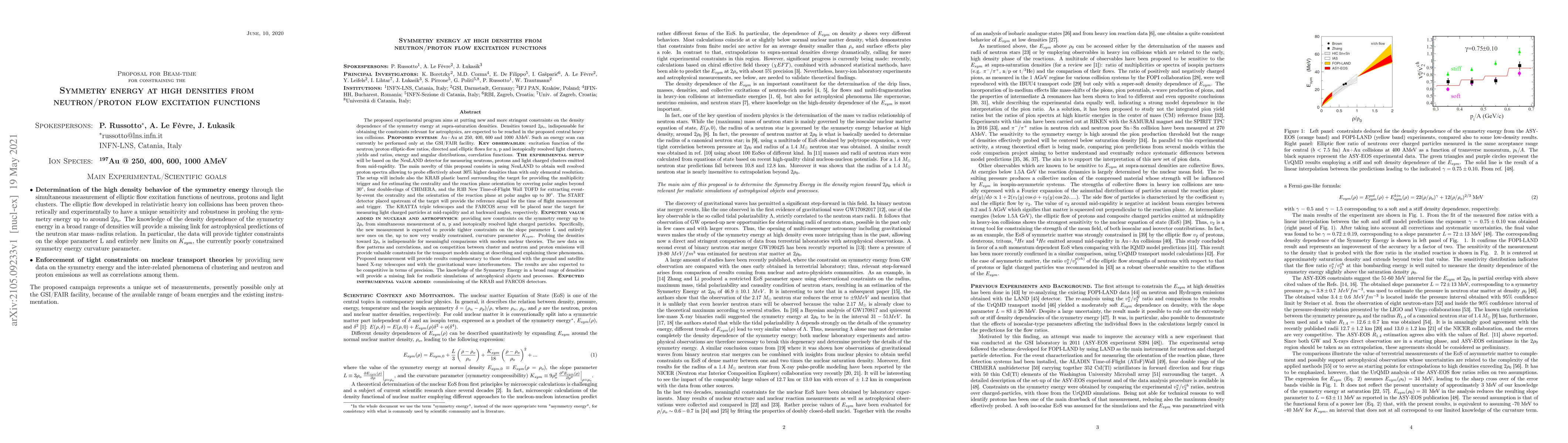 Determination of the high density behavior of the symmetry energy through the simultaneous measurement of elliptic flow excitation functions of neutrons, protons and light clusters is proposed. The elliptic flow developed in relativistic heavy ion collisions has been proven theoretically and experimentally to have a unique sensitivity and robustness in probing the symmetry energy up to around $2 \rho_{o}$. The knowledge of the density dependence of the symmetry energy in a broad range of densities will provide a missing link for astrophysical predictions of the neutron star mass--radius relation. In particular, the data colud provide tighter constraints on the slope parameter L and entirely new limits on $K_{sym}$, the currently poorly constrained symmetry energy curvature parameter.