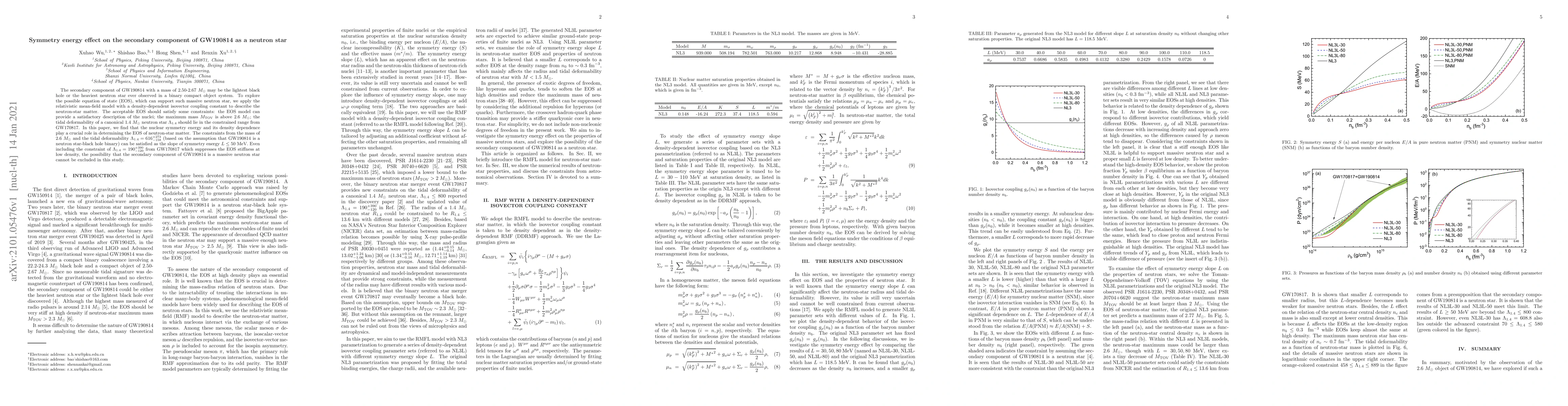 This paper investigates the equation of state (EOS) for the secondary component of GW190814, which may be a neutron star or a black hole, using the relativistic mean-field model. The study finds that the nuclear symmetry energy's density dependence is crucial for supporting a neutron star with a mass up to 2.6 $M_{\odot}$, satisfying observational constraints from GW170817.