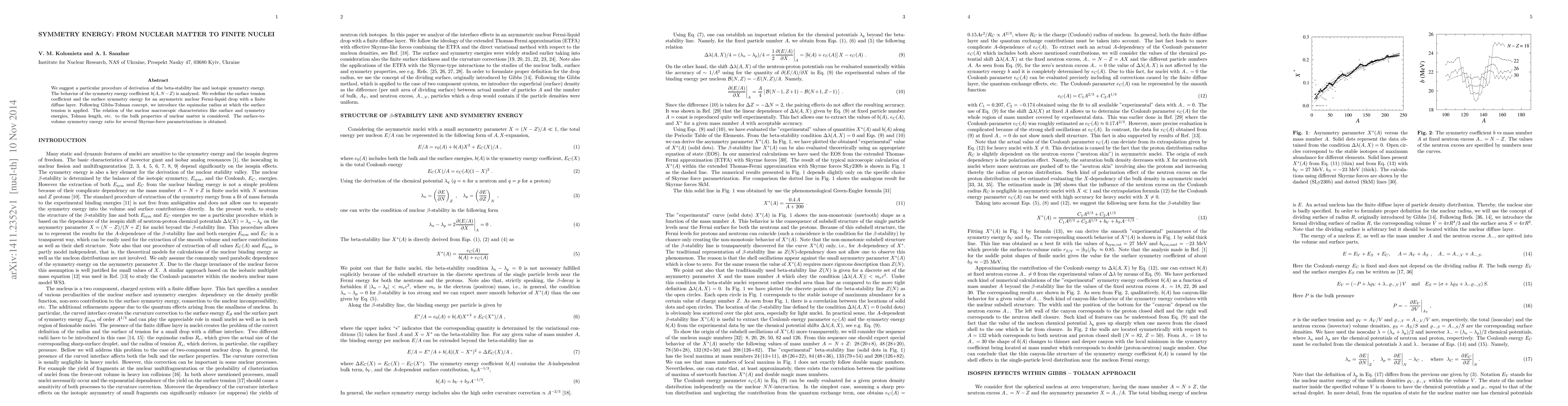 We suggest a particular procedure of derivation of the beta-stability line and isotopic symmetry energy. The behavior of the symmetry energy coefficient $b(A,N-Z)$ is analyzed. We redefine the surface tension coefficient and the surface symmetry energy for an asymmetric nuclear Fermi-liquid drop with a finite diffuse layer. Following Gibbs-Tolman concept, we introduce the equimolar radius at which the surface tension is applied. The relation of the nuclear macroscopic characteristics like surface and symmetry energies, Tolman length, etc. to the bulk properties of nuclear matter is considered. The surface-to-volume symmetry energy ratio for several Skyrme-force parametrizations is obtained.