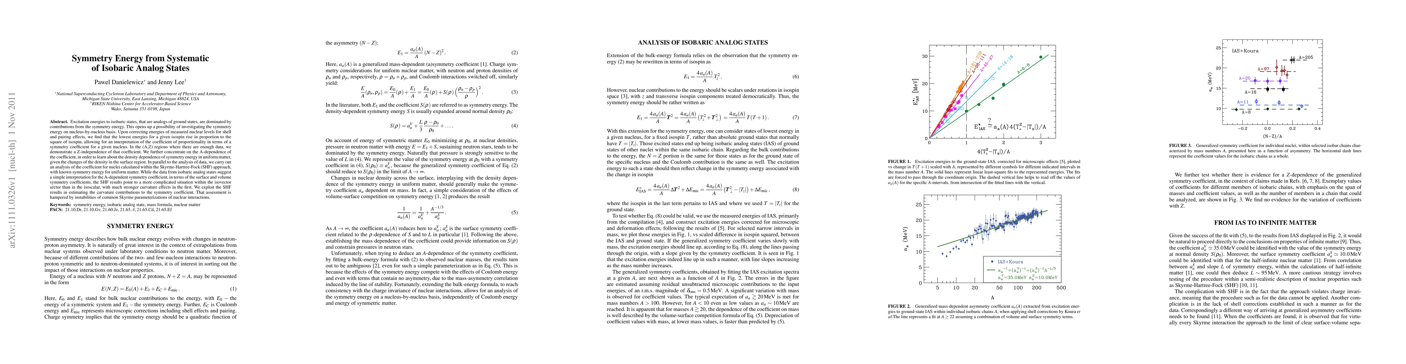 This paper investigates the symmetry energy through the systematics of isobaric analog states, revealing a proportionality between the lowest excitation energies and the square of isospin. The study finds a Z-independence of the symmetry coefficient in certain (A,Z) regions, and explores its A-dependence to infer the density dependence of symmetry energy in uniform matter.