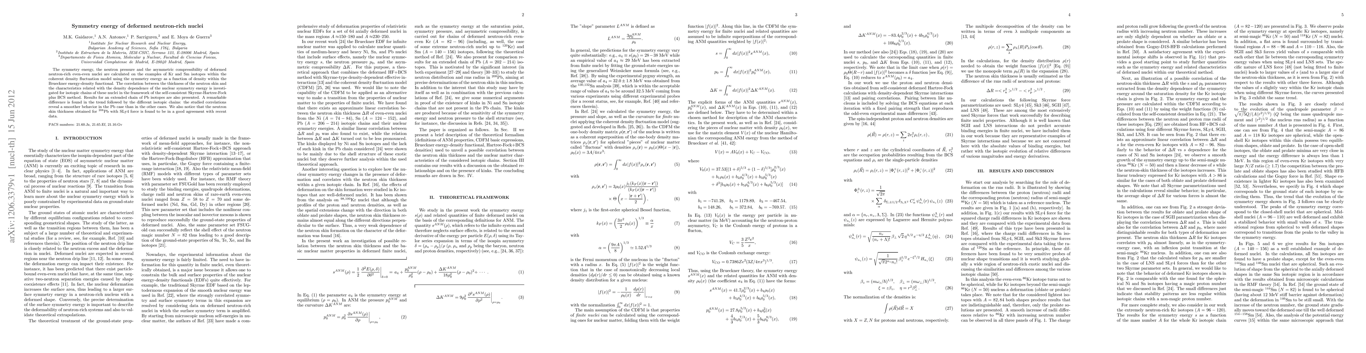 The symmetry energy, the neutron pressure and the asymmetric compressibility of deformed neutron-rich even-even nuclei are calculated on the examples of Kr and Sm isotopes within the coherent density fluctuation model using the symmetry energy as a function of density within the Brueckner energy-density functional. The correlation between the thickness of the neutron skin and the characteristics related with the density dependence of the nuclear symmetry energy is investigated for isotopic chains of these nuclei in the framework of the self-consistent Skyrme-Hartree-Fock plus BCS method. Results for an extended chain of Pb isotopes are also presented. A remarkable difference is found in the trend followed by the different isotopic chains: the studied correlations reveal a smoother behavior in the Pb case than in the other cases. We also notice that the neutron skin thickness obtained for $^{208}$Pb with SLy4 force is found to be in a good agreement with recent data.