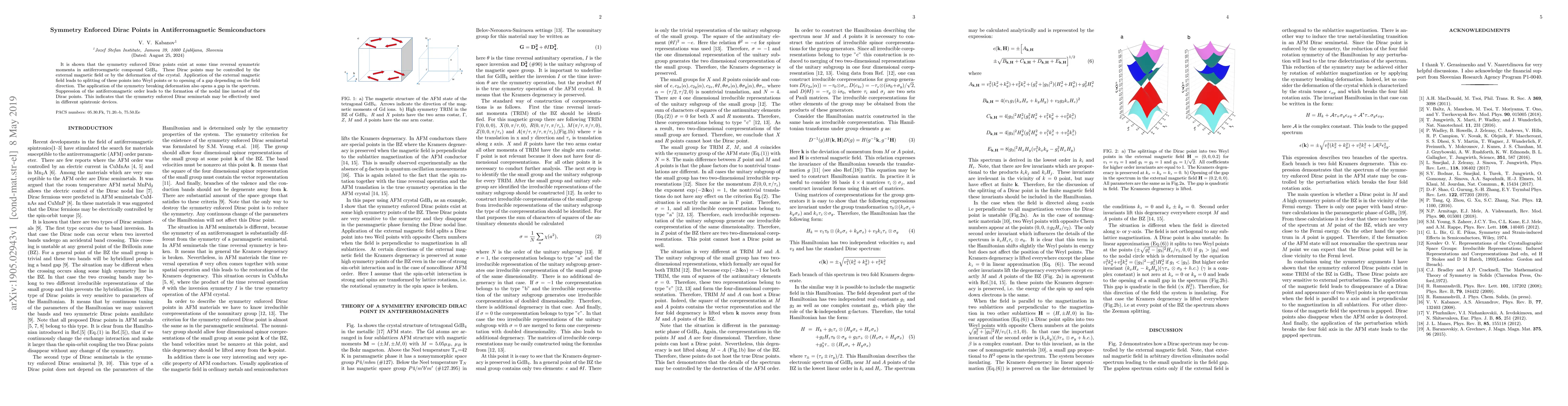 It is shown that the symmetry enforced Dirac points exist at some time reversal symmetric momenta in antiferroemgnetic compound GdB$_4$. These Dirac points may be controlled by the external magnetic field or by the deformation of the crystal. Application of the external magnetic field leads to splitting of these points into Weyl points or to opening of a gap depending on the field direction. The application of the symmetry breaking deformation also opens a gap in the spectrum. Suppression of the antiferromagnetic order leads to the formation of the nodal line instead of the Dirac points. This indicates that the symmetry enforced Dirac semimetals may be effectively used in different spintronic devices.