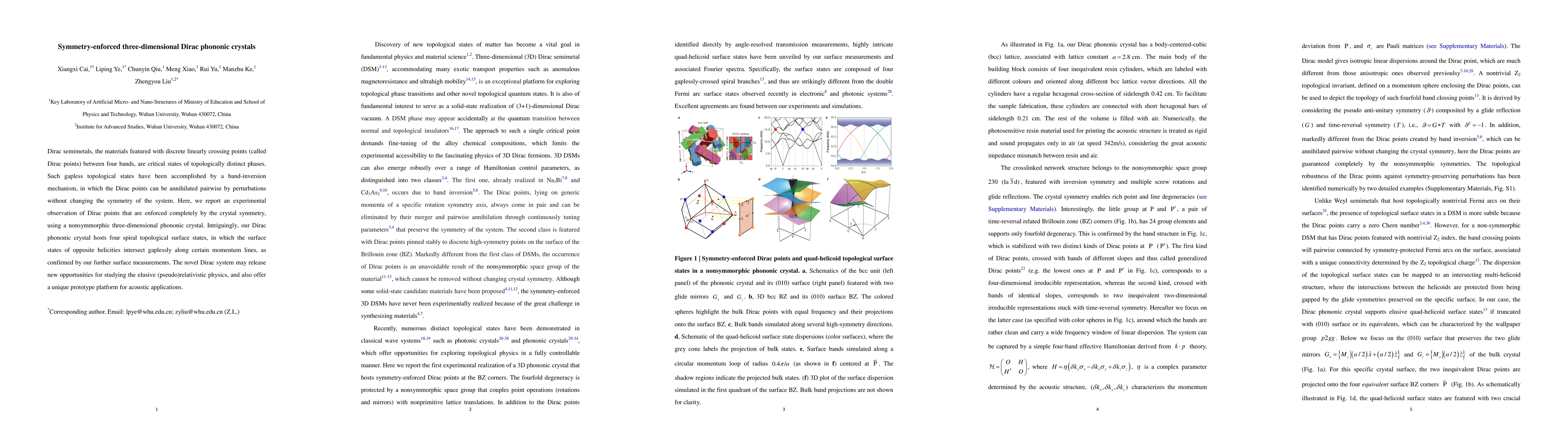 The research observes symmetry-enforced three-dimensional Dirac points in phononic crystals, revealing four spiral topological surface states and opening new avenues for studying relativistic physics and acoustic applications. Surface measurements confirm the gapless intersection of surface states of opposite helicities.