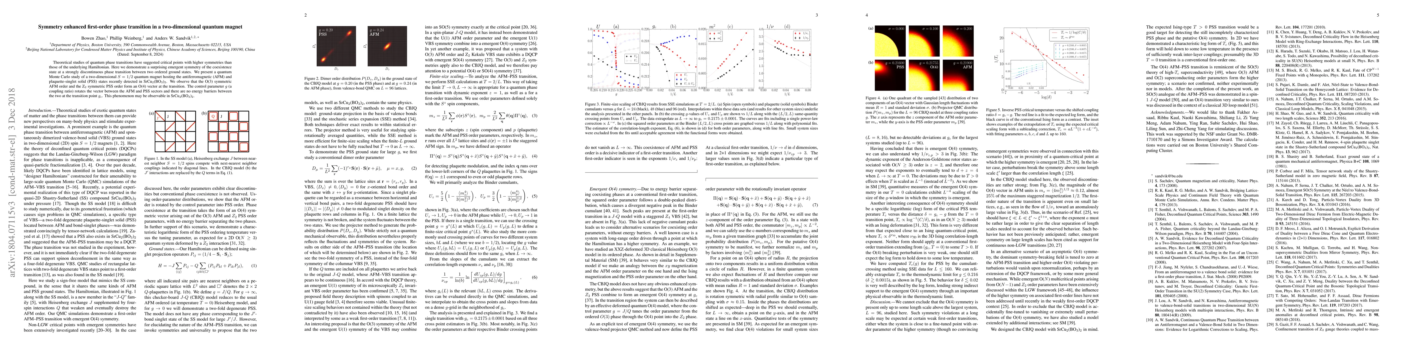 This paper reports a quantum Monte Carlo study showing an emergent O(4) symmetry at a first-order phase transition in a two-dimensional $S=1/2$ quantum magnet, bridging antiferromagnetic and plaquette-singlet solid states. The transition lacks energy barriers at a critical coupling ratio, suggesting possible experimental observation in SrCu$_2$(BO$_3$)$_2$.