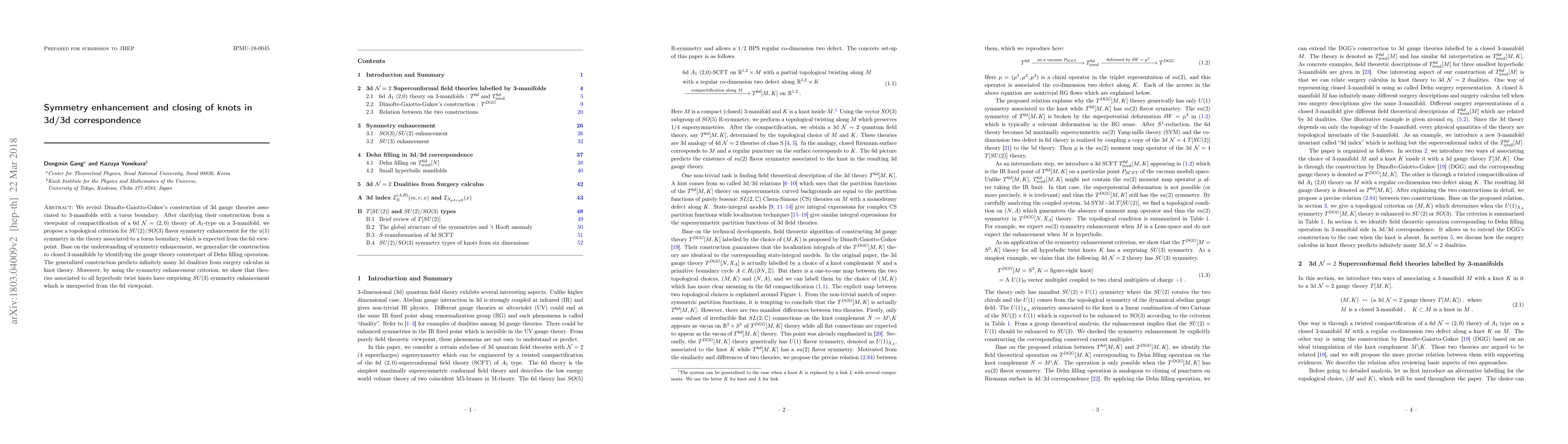 We revisit Dimofte-Gaiotto-Gukov's construction of 3d gauge theories associated to 3-manifolds with a torus boundary. After clarifying their construction from a viewpoint of compactification of a 6d $\mathcal{N}=(2,0)$ theory of $A_1$-type on a 3-manifold, we propose a topological criterion for $SU(2)/SO(3)$ flavor symmetry enhancement for the $u(1)$ symmetry in the theory associated to a torus boundary, which is expected from the 6d viewpoint. Base on the understanding of symmetry enhancement, we generalize the construction to closed 3-manifolds by identifying the gauge theory counterpart of Dehn filling operation. The generalized construction predicts infinitely many 3d dualities from surgery calculus in knot theory. Moreover, by using the symmetry enhancement criterion, we show that theories associated to all hyperboilc twist knots have surprising $SU(3)$ symmetry enhancement which is unexpected from the 6d viewpoint.