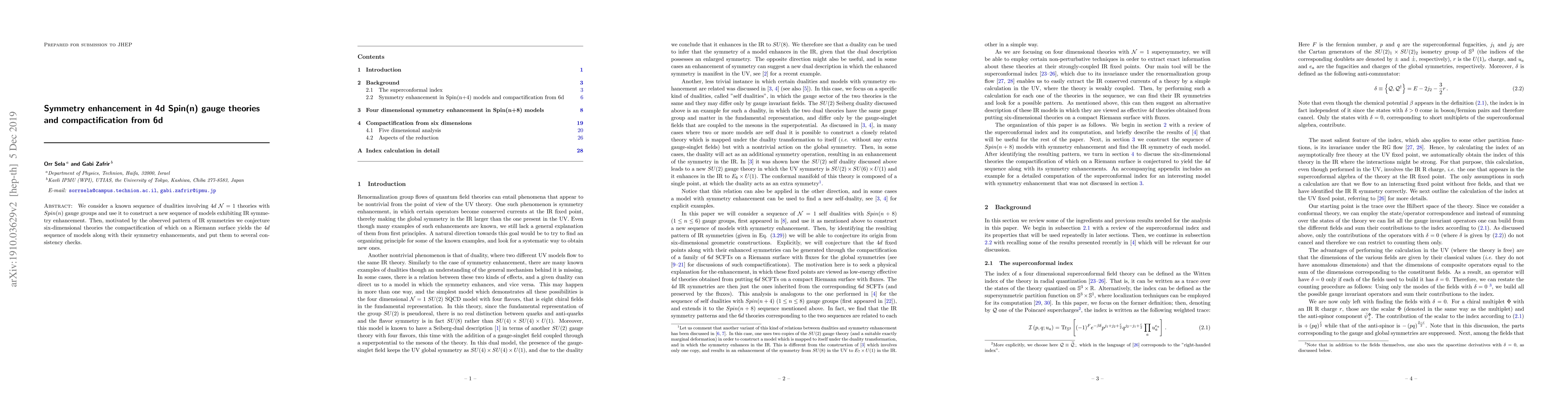 This paper constructs a new sequence of $4d$ ${\cal N}=1$ Spin(n) gauge theories with infrared symmetry enhancement using known dualities, and conjectures a $6d$ theory whose compactification on a Riemann surface reproduces these models and their enhancements, supported by several consistency checks.