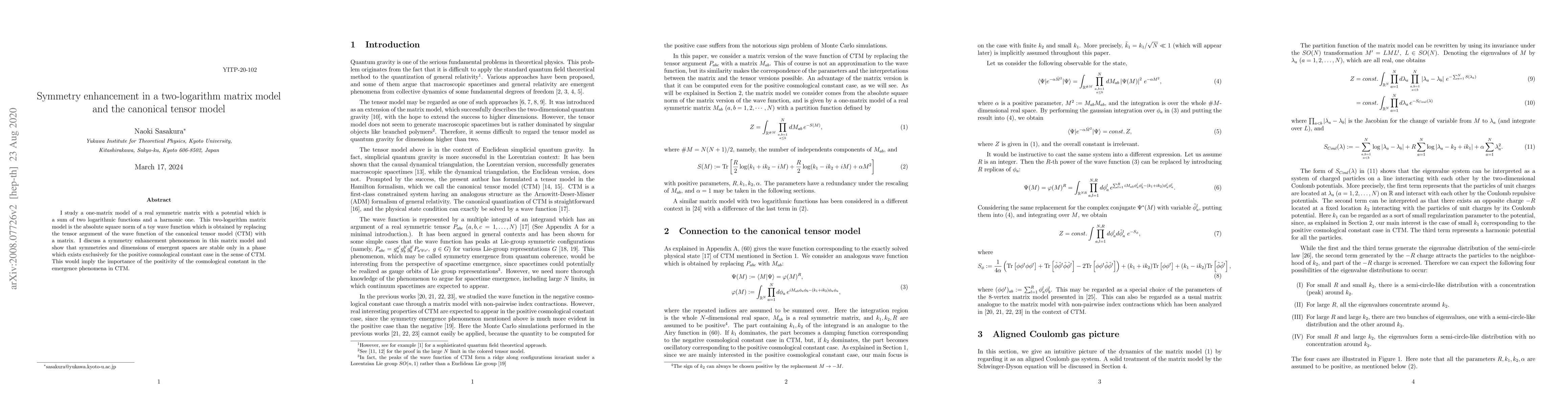 I study a one-matrix model of a real symmetric matrix with a potential which is a sum of two logarithmic functions and a harmonic one. This two-logarithm matrix model is the absolute square norm of a toy wave function which is obtained by replacing the tensor argument of the wave function of the canonical tensor model (CTM) with a matrix. I discuss a symmetry enhancement phenomenon in this matrix model and show that symmetries and dimensions of emergent spaces are stable only in a phase which exists exclusively for the positive cosmological constant case in the sense of CTM. This would imply the importance of the positivity of the cosmological constant in the emergence phenomena in CTM.
