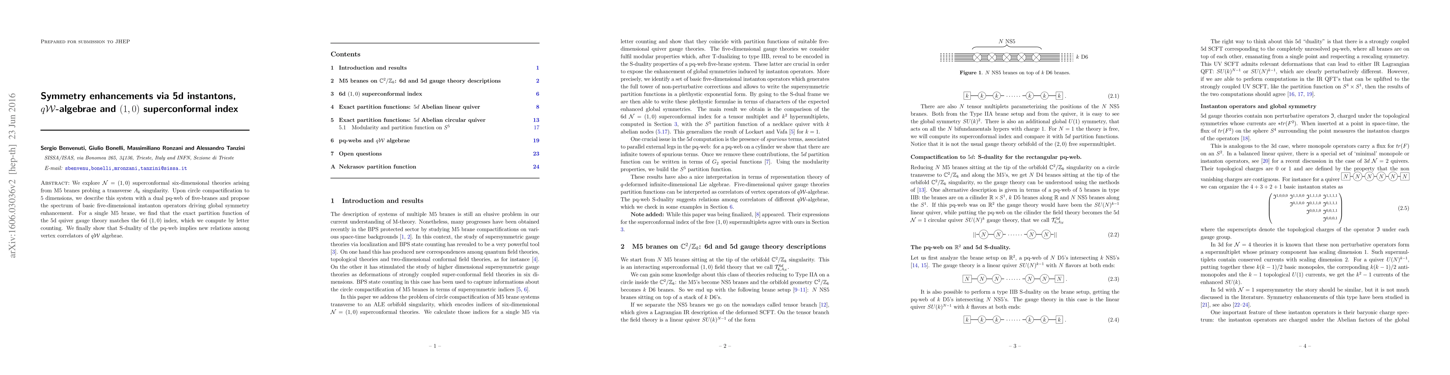 We explore N=(1,0) superconformal six-dimensional theories arising from M5-branes probing a transverse A_k singularity. Upon circle compactification to 5 dimensions, we describe this system with a dual pq-web of five-branes and propose the spectrum of basic five-dimensional instanton operators driving global symmetry enhancement. For a single M5-brane, we find that the exact partition function of the 5d quiver gauge theory matches the 6d (1,0) index, which we compute by letter counting. We finally show that S-duality of the pq-web implies new relations among vertex correlators of qW-algebrae.