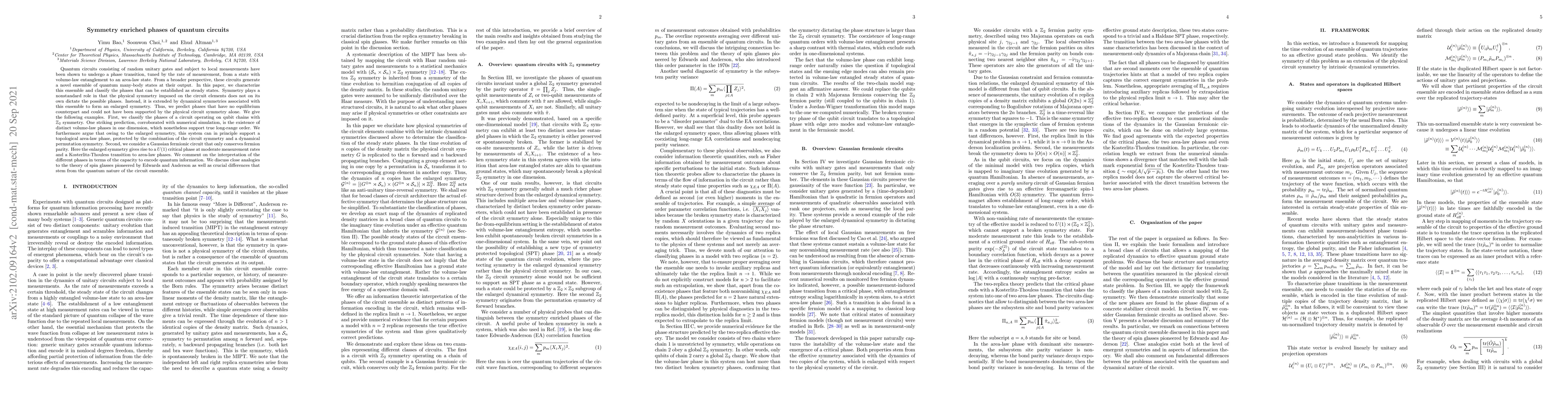 Quantum circuits consisting of random unitary gates and subject to local measurements have been shown to undergo a phase transition, tuned by the rate of measurement, from a state with volume-law entanglement to an area-law state. From a broader perspective, these circuits generate a novel ensemble of quantum many-body states at their output. In this paper, we characterize this ensemble and classify the phases that can be established as steady states. Symmetry plays a nonstandard role in that the physical symmetry imposed on the circuit elements does not on its own dictate the possible phases. Instead, it is extended by dynamical symmetries associated with this ensemble to form an enlarged symmetry. Thus, we predict phases that have no equilibrium counterpart and could not have been supported by the physical circuit symmetry alone. We give the following examples. First, we classify the phases of a circuit operating on qubit chains with $\mathbb{Z}_2$ symmetry. One striking prediction, corroborated with numerical simulation, is the existence of distinct volume-law phases in one dimension, which nonetheless support true long-range order. We furthermore argue that owing to the enlarged symmetry, this system can in principle support a topological area-law phase, protected by the combination of the circuit symmetry and a dynamical permutation symmetry. Second, we consider a Gaussian fermionic circuit that only conserves fermion parity. Here the enlarged symmetry gives rise to a $U(1)$ critical phase at moderate measurement rates and a Kosterlitz-Thouless transition to area-law phases. We comment on the interpretation of the different phases in terms of the capacity to encode quantum information. We discuss close analogies to the theory of spin glasses pioneered by Edwards and Anderson as well as crucial differences that stem from the quantum nature of the circuit ensemble.