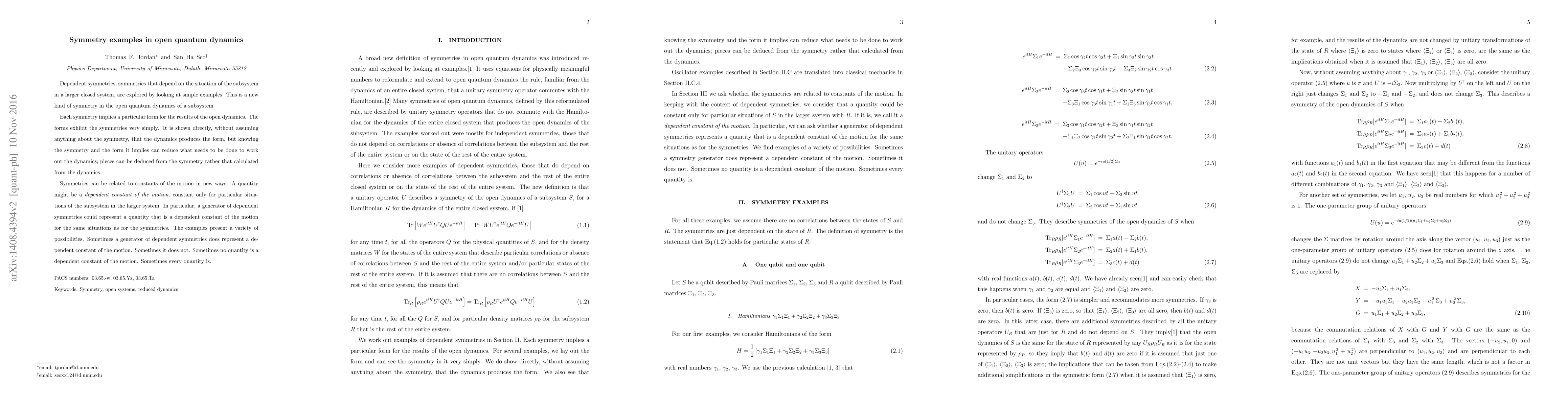 Dependent symmetries, symmetries that depend on the situation of the subsystem in a larger closed system, are explored by looking at simple examples. This is a new kind of symmetry in the open quantum dynamics of a subsystem Each symmetry implies a particular form for the results of the open dynamics. The forms exhibit the symmetries very simply. It is shown directly, without assuming anything about the symmetry, that the dynamics produces the form, but knowing the symmetry and the form it implies can reduce what needs to be done to work out the dynamics; pieces can be deduced from the symmetry rather that calculated from the dynamics. Symmetries can be related to constants of the motion in new ways. A quantity might be a dependent constant of the motion, constant only for particular situations of the subsystem in the larger system. In particular, a generator of dependent symmetries could represent a quantity that is a dependent constant of the motion for the same situations as for the symmetries. The examples present a variety of possibilities. Sometimes a generator of dependent symmetries does represent a dependent constant of the motion. Sometimes it does not. Sometimes no quantity is a dependent constant of the motion. Sometimes every quantity is.