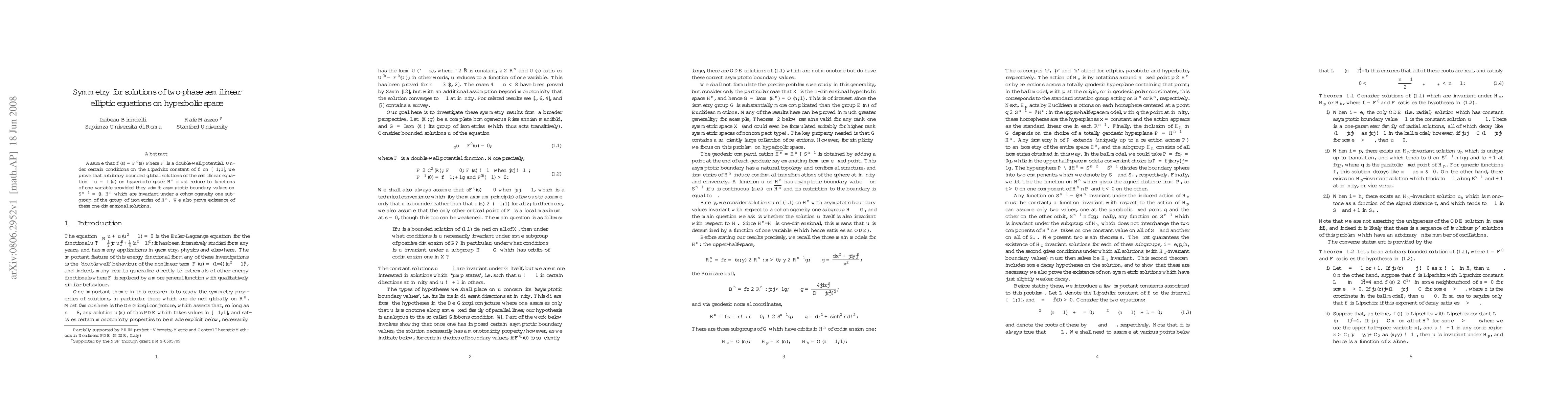 Assume that $f(s) = F'(s)$ where $F$ is a double-well potential. Under certain conditions on the Lipschitz constant of $f$ on $[-1,1]$, we prove that arbitrary bounded global solutions of the semilinear equation $\Delta u = f(u)$ on hyperbolic space $\HH^n$ must reduce to functions of one variable provided they admit asymptotic boundary values on the infinite boundary of $\HH^n$ which are invariant under a cohomogeneity one subgroup of the group of isometries of $\HH^n$. We also prove existence of these one-dimensional solutions.