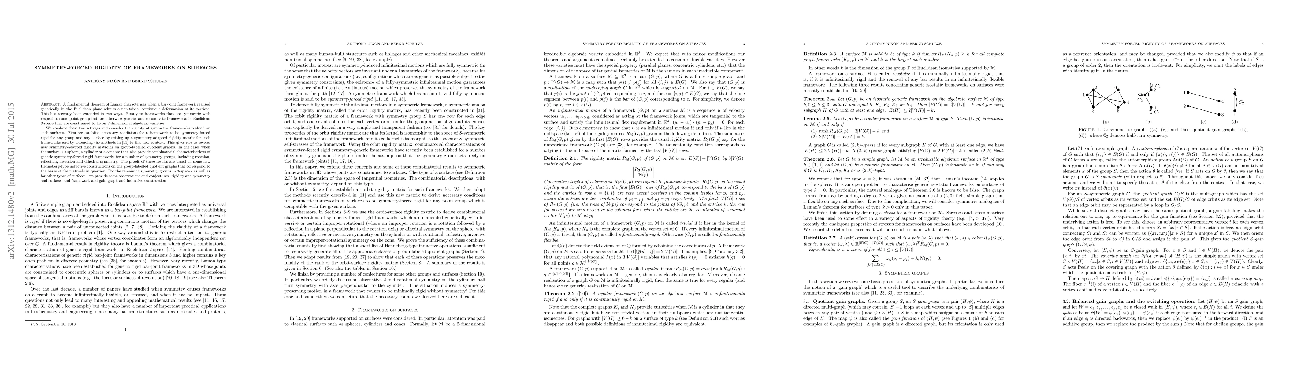 This paper extends Laman's theorem to symmetric frameworks on surfaces, proving necessary conditions for symmetry-forced rigidity. It provides sufficient conditions for spheres, cylinders, and cones under specific symmetry groups, and offers observations and conjectures for other cases.
