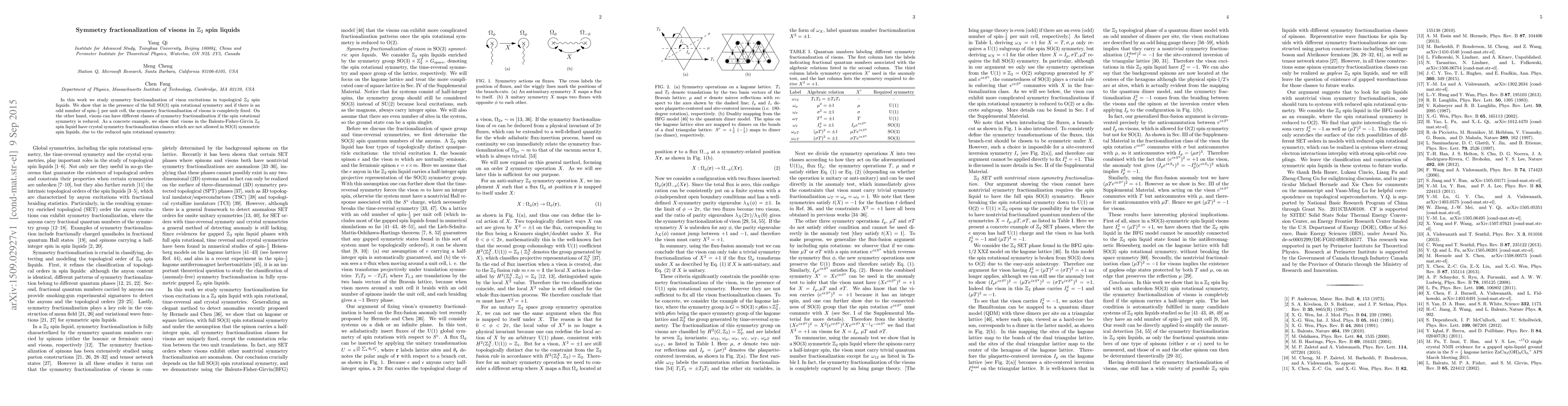 This paper investigates the symmetry fractionalization of vison excitations in topological $\mathbb{Z}_2$ spin liquids, demonstrating that full $\mathrm{SO}(3)$ spin rotational symmetry with an odd number of spin-$\frac12$ per unit cell fixes symmetry fractionalization. It also highlights that reduced spin rotational symmetry allows different classes of vison fractionalization, exemplified by the Balents-Fisher-Girvin $\mathbb{Z}_2$ spin liquid.