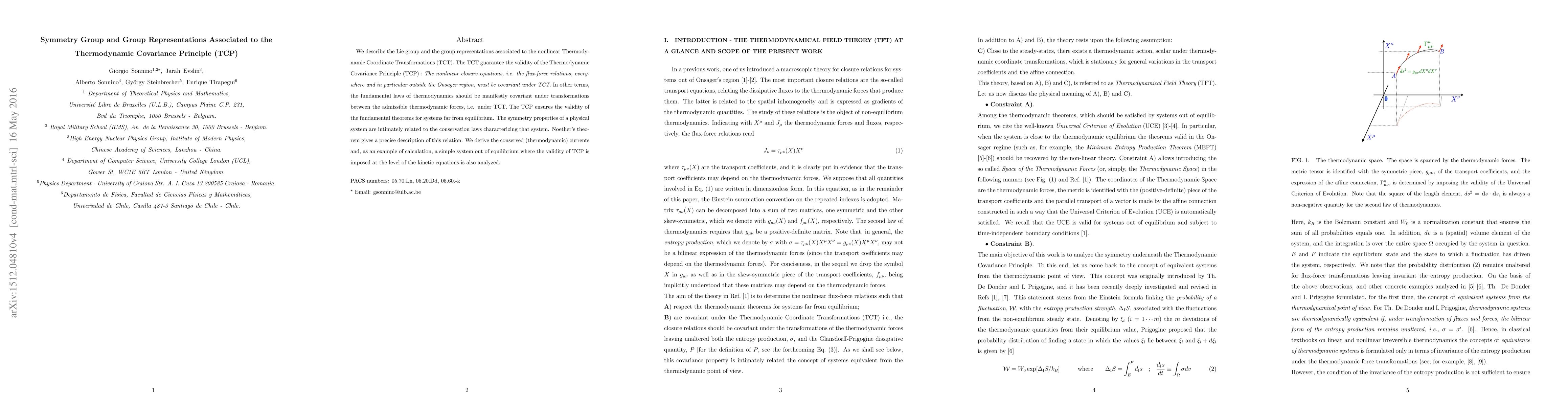 We describe the Lie group and the group representations associated to the nonlinear Thermodynamic Coordinate Transformations (TCT). The TCT guarantee the validity of the Thermodynamic Covariance Principle (TCP) : {\it The nonlinear closure equations, i.e. the flux-force relations, everywhere and in particular outside the Onsager region, must be covariant under TCT}. In other terms, the fundamental laws of thermodynamics should be manifestly covariant under transformations between the admissible thermodynamic forces, i.e. under TCT. The TCP ensures the validity of the fundamental theorems for systems far from equilibrium. The symmetry properties of a physical system are intimately related to the conservation laws characterizing that system. Noether's theorem gives a precise description of this relation. We derive the conserved (thermodynamic) currents and, as an example of calculation, a simple system out of equilibrium where the validity of TCP is imposed at the level of the kinetic equations is also analyzed.