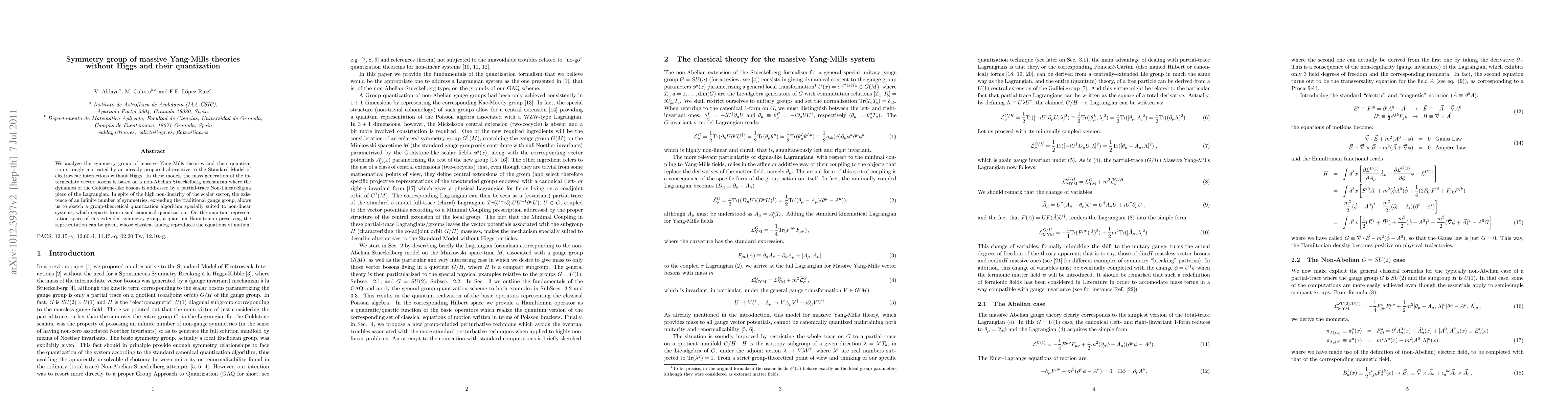 This paper explores the symmetry group of massive Yang-Mills theories without a Higgs mechanism, proposing a non-Abelian Stueckelberg mechanism for mass generation. It introduces a novel quantization algorithm for these non-linear systems, extending beyond traditional gauge groups and providing a quantum Hamiltonian that reproduces the classical equations of motion.