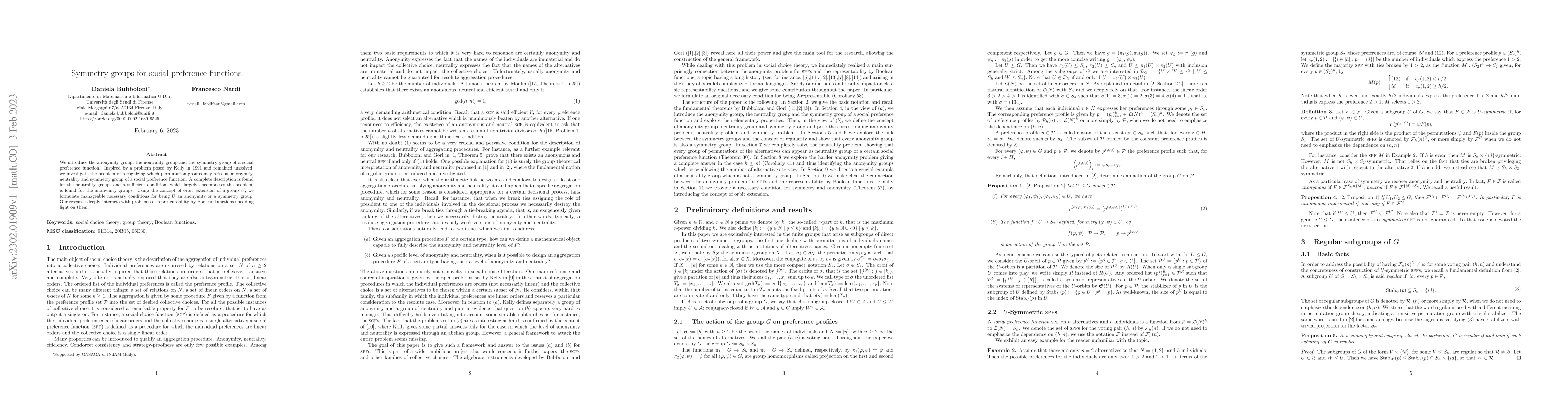 We introduce the anonymity group, the neutrality group and the symmetry group of a social preference function. Inspired by a problem posed by Kelly in 1991 and remained unsolved, we investigate the problem of recognizing which permutation groups may arise as anonymity, neutrality and symmetry group of a social preference function. A complete description is found for the neutrality groups and a sufficient condition, which largely encompasses the problem, is found for the anonymity groups. Using the concept of orbit extension of a group $U$, we formulate manageable necessary conditions for being $U$ an anonymity or a symmetry group. Our research deeply interacts with problems of representability by Boolean functions shedding light on them.