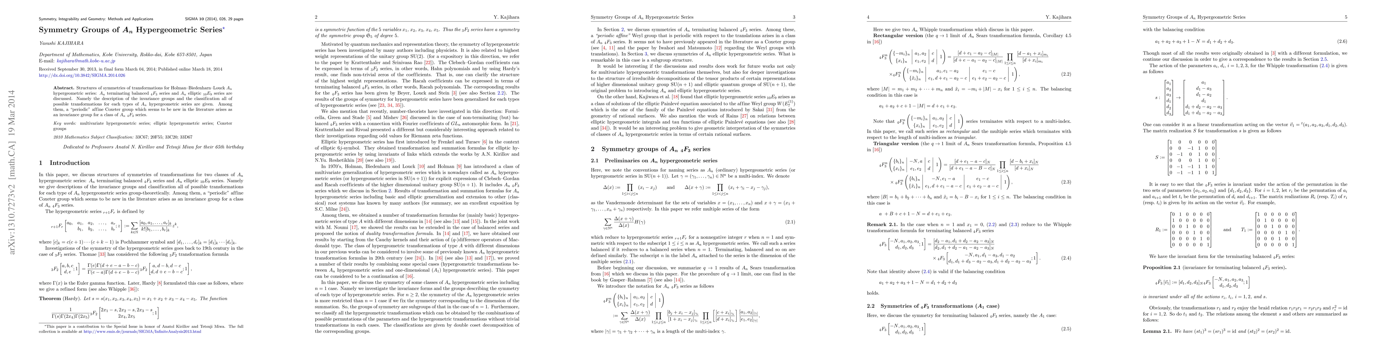 Structures of symmetries of transformations for Holman-Biedenharn-Louck $A_n$ hypergeometric series: $A_n$ terminating balanced ${}_4 F_3$ series and $A_n$ elliptic ${}_{10} E_9$ series are discussed. Namely the description of the invariance groups and the classification all of possible transformations for each types of $A_n$ hypergeometric series are given. Among them, a "periodic" affine Coxeter group which seems to be new in the literature arises as an invariance group for a class of $A_n$ ${}_4 F_3$ series.