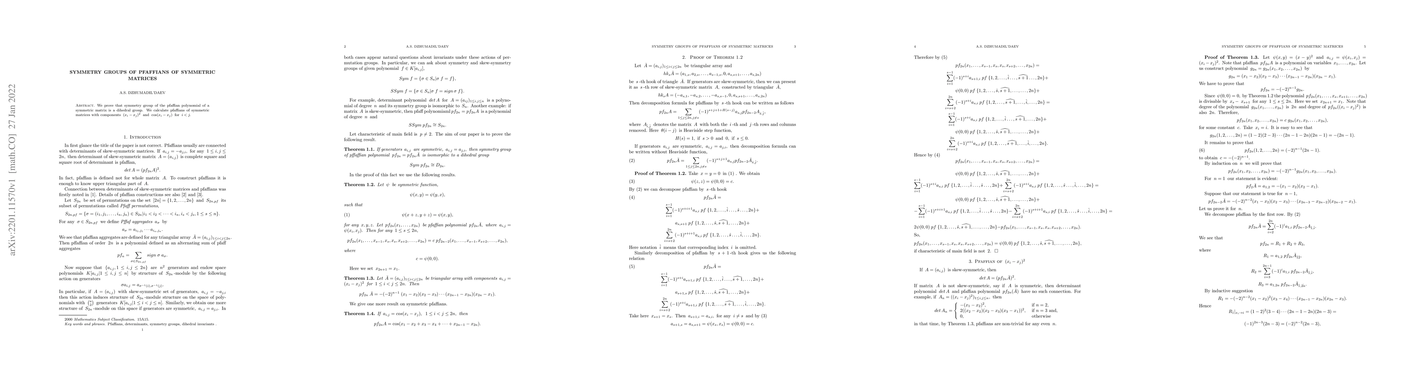 This paper proves that the symmetry group of the pfaffian polynomial of a symmetric matrix is a dihedral group. It also calculates pfaffians for specific symmetric matrices with components involving squared differences and cosines of those differences.
