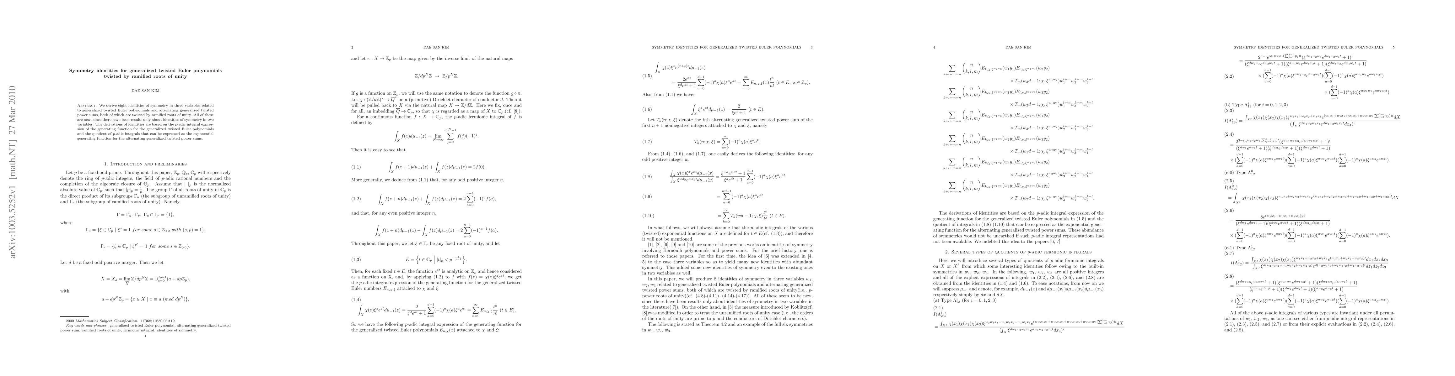 We derive eight identities of symmetry in three variables related to generalized twisted Euler polynomials and alternating generalized twisted power sums, both of which are twisted by ramified roots of unity. All of these are new, since there have been results only about identities of symmetry in two variables. The derivations of identities are based on the $p$-adic integral expression of the generating function for the generalized twisted Euler polynomials and the quotient of $p$-adic integrals that can be expressed as the exponential generating function for the alternating generalized twisted power sums.