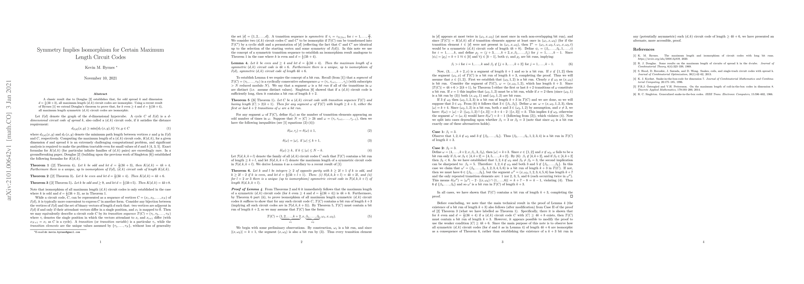 A classic result due to Douglas establishes that, for odd spread $k$ and dimension $d=\frac{1}{2}(3k+3)$, all maximum length $(d,k)$ circuit codes are isomorphic. Using a recent result of Byrnes we extend Douglas's theorem to prove that, for $k$ even $\ge 4$ and $d=\frac{1}{2}(3k+4)$, all maximum length symmetric $(d,k)$ circuit codes are isomorphic.