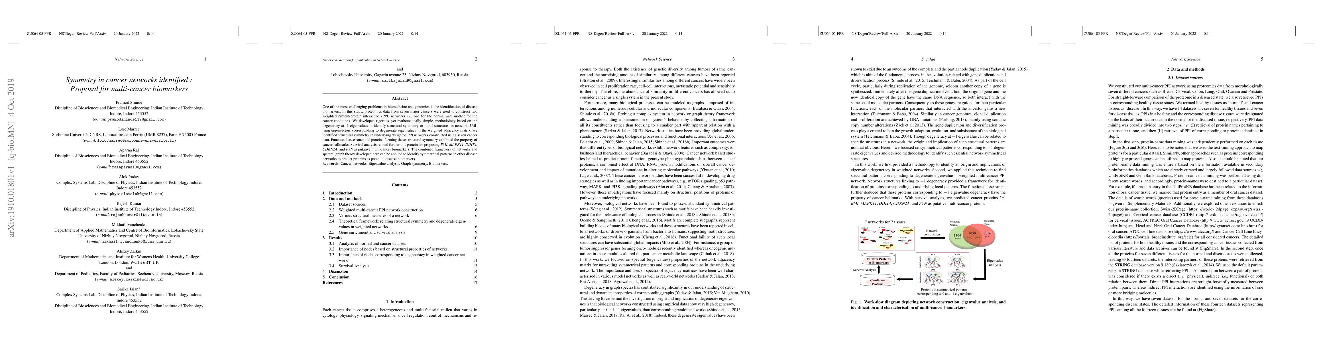 One of the most challenging problems in biomedicine and genomics is the identification of disease biomarkers. In this study, proteomics data from seven major cancers were used to construct two weighted protein-protein interaction (PPI) networks i.e., one for the normal and another for the cancer conditions. We developed rigorous, yet mathematically simple, methodology based on the degeneracy at -1 eigenvalues to identify structural symmetry or motif structures in network. Utilising eigenvectors corresponding to degenerate eigenvalues in the weighted adjacency matrix, we identified structural symmetry in underlying weighted PPI networks constructed using seven cancer data. Functional assessment of proteins forming these structural symmetry exhibited the property of cancer hallmarks. Survival analysis refined further this protein list proposing BMI, MAPK11, DDIT4, CDKN2A, and FYN as putative multi-cancer biomarkers. The combined framework of networks and spectral graph theory developed here can be applied to identify symmetrical patterns in other disease networks to predict proteins as potential disease biomarkers.