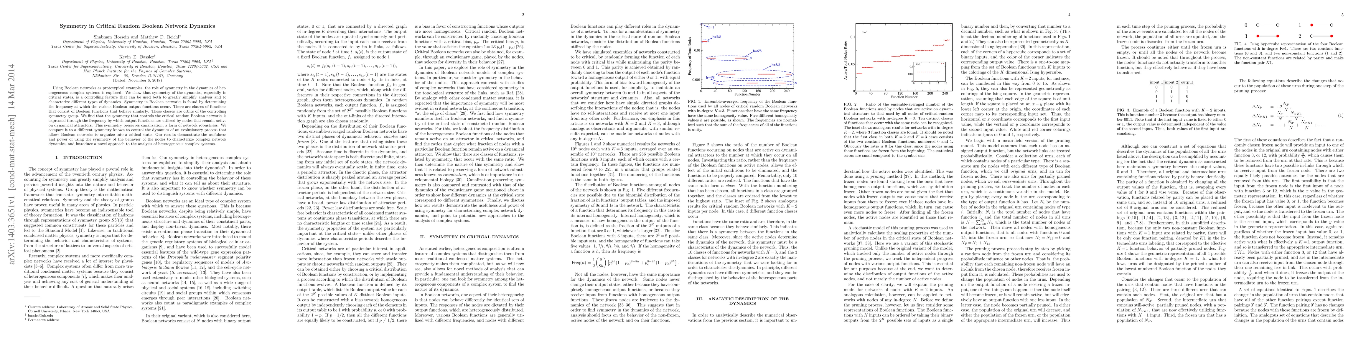 Using Boolean networks as prototypical examples, the role of symmetry in the dynamics of heterogeneous complex systems is explored. We show that symmetry of the dynamics, especially in critical states, is a controlling feature that can be used both to greatly simplify analysis and to characterize different types of dynamics. Symmetry in Boolean networks is found by determining the frequency at which the various Boolean output functions occur. There are classes of functions that consist of Boolean functions that behave similarly. These classes are orbits of the controlling symmetry group. We find that the symmetry that controls the critical random Boolean networks is expressed through the frequency by which output functions are utilized by nodes that remain active on dynamical attractors. This symmetry preserves canalization, a form of network robustness. We compare it to a different symmetry known to control the dynamics of an evolutionary process that allows Boolean networks to organize into a critical state. Our results demonstrate the usefulness and power of using the symmetry of the behavior of the nodes to characterize complex network dynamics, and introduce a novel approach to the analysis of heterogeneous complex systems.