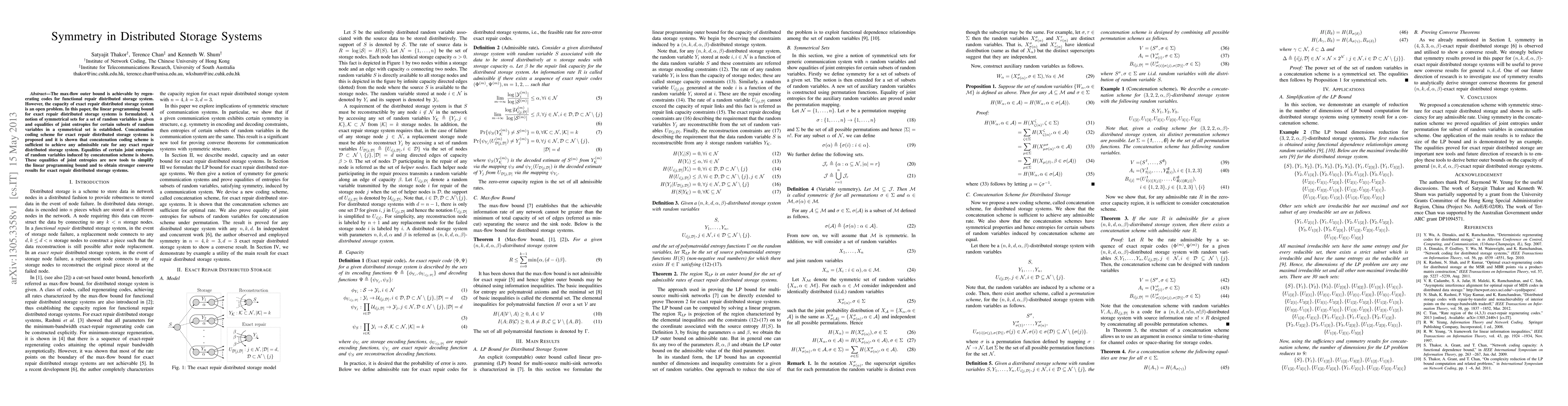 The max-flow outer bound is achievable by regenerating codes for functional repair distributed storage system. However, the capacity of exact repair distributed storage system is an open problem. In this paper, the linear programming bound for exact repair distributed storage systems is formulated. A notion of symmetrical sets for a set of random variables is given and equalities of joint entropies for certain subsets of random variables in a symmetrical set is established. Concatenation coding scheme for exact repair distributed storage systems is proposed and it is shown that concatenation coding scheme is sufficient to achieve any admissible rate for any exact repair distributed storage system. Equalities of certain joint entropies of random variables induced by concatenation scheme is shown. These equalities of joint entropies are new tools to simplify the linear programming bound and to obtain stronger converse results for exact repair distributed storage systems.