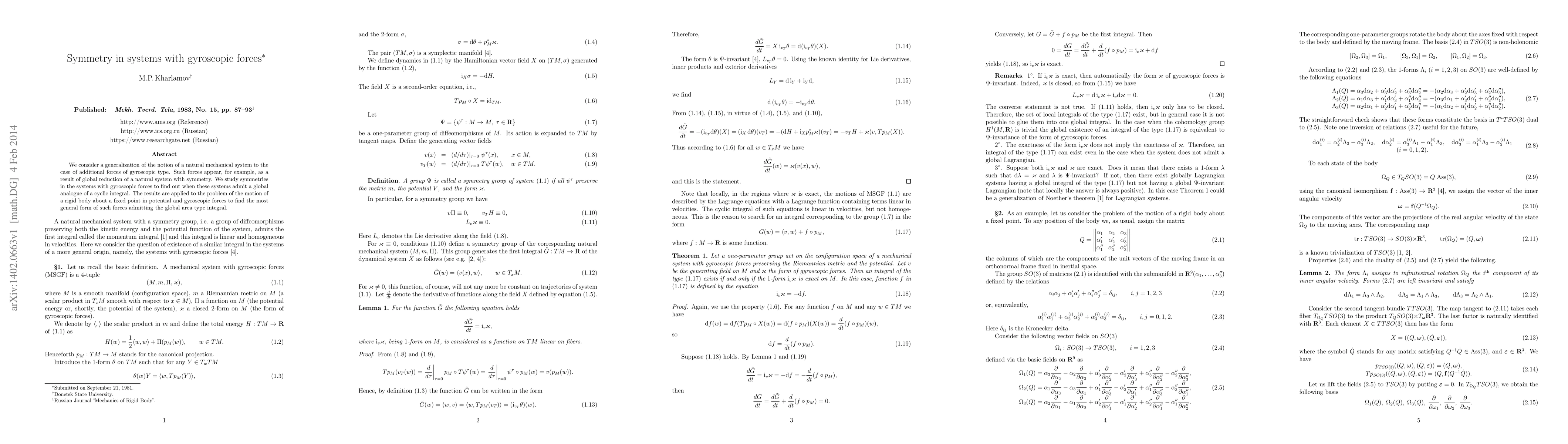 We consider a generalization of the notion of a natural mechanical system to the case of additional forces of gyroscopic type. Such forces appear, for example, as a result of global reduction of a natural system with symmetry. We study symmetries in the systems with gyroscopic forces to find out when these systems admit a global analogue of a cyclic integral. The results are applied to the problem of the motion of a rigid body about a fixed point in potential and gyroscopic forces to find the most general form of such forces admitting the global area type integral.