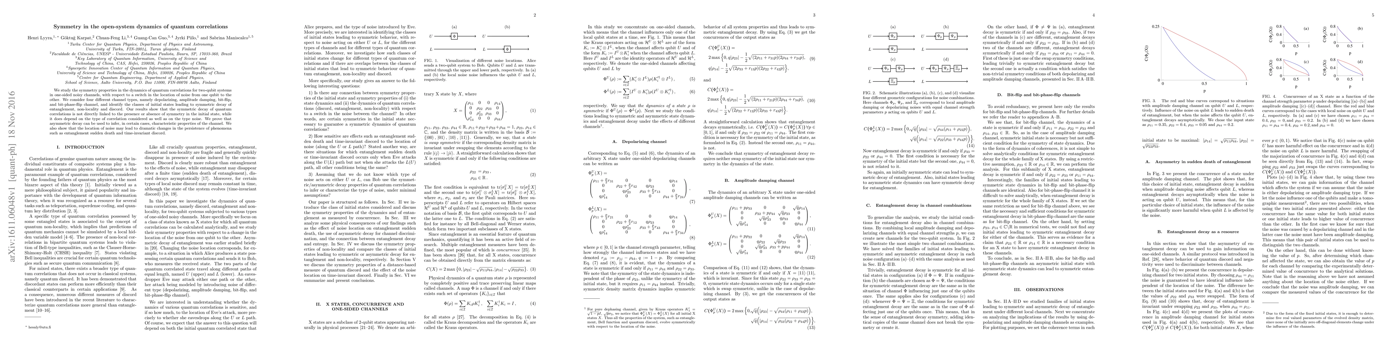This research explores how symmetry affects the decay of quantum correlations in two-qubit systems under one-sided noise. It identifies initial state classes causing symmetric decay of entanglement, non-locality, and discord across four channel types. The study reveals that symmetric decay isn't tied to initial state symmetry but depends on correlation type and noise. Asymmetric decay can reveal channel properties, and noise location impacts phenomena like entanglement sudden death and time-invariant discord persistence.