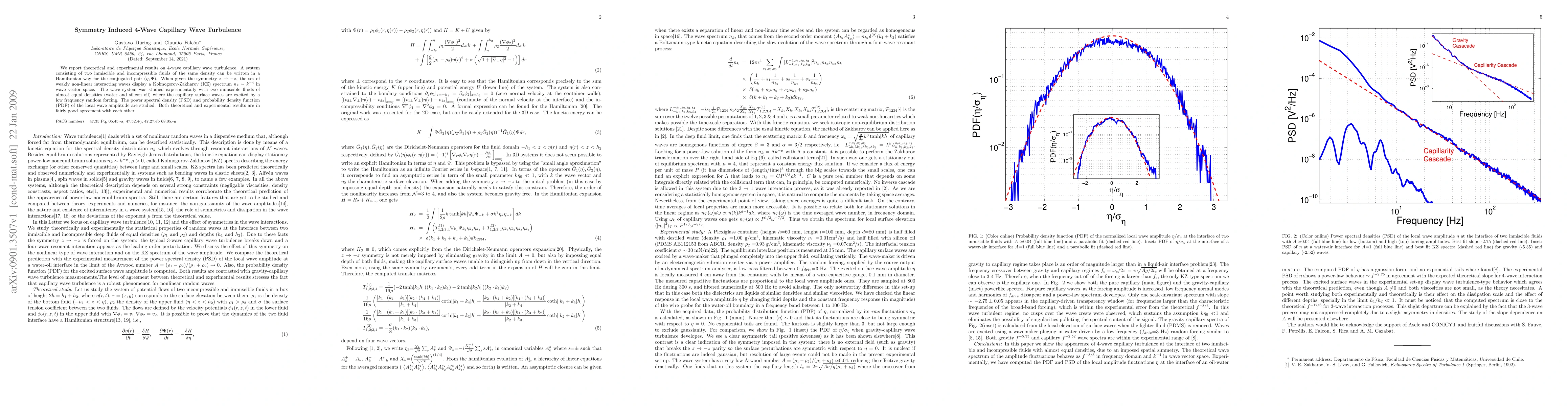 This paper presents theoretical and experimental findings on 4-wave capillary wave turbulence, showing that a Hamiltonian system of two inmiscible fluids exhibits a Kolmogorov-Zakharov spectrum under symmetry conditions. Experimental results using water and silicon oil match theoretical predictions for power spectral density and wave amplitude distributions.