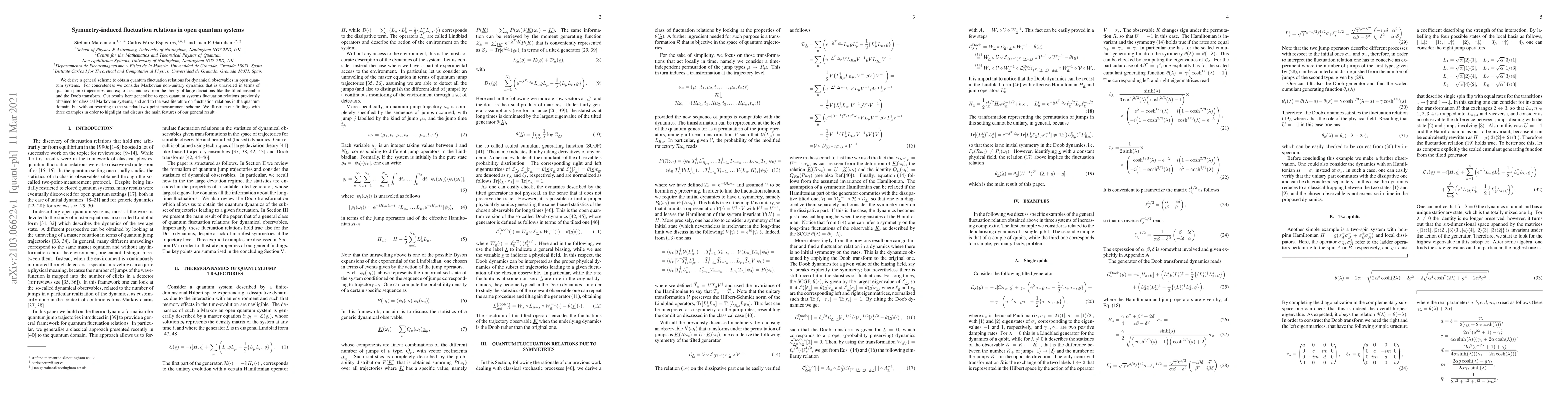 This paper presents a novel method for deriving quantum fluctuation relations in open quantum systems, generalizing classical results without relying on standard two-point measurements. The authors use quantum jump trajectories and large deviation techniques to achieve this, illustrated through three specific examples.