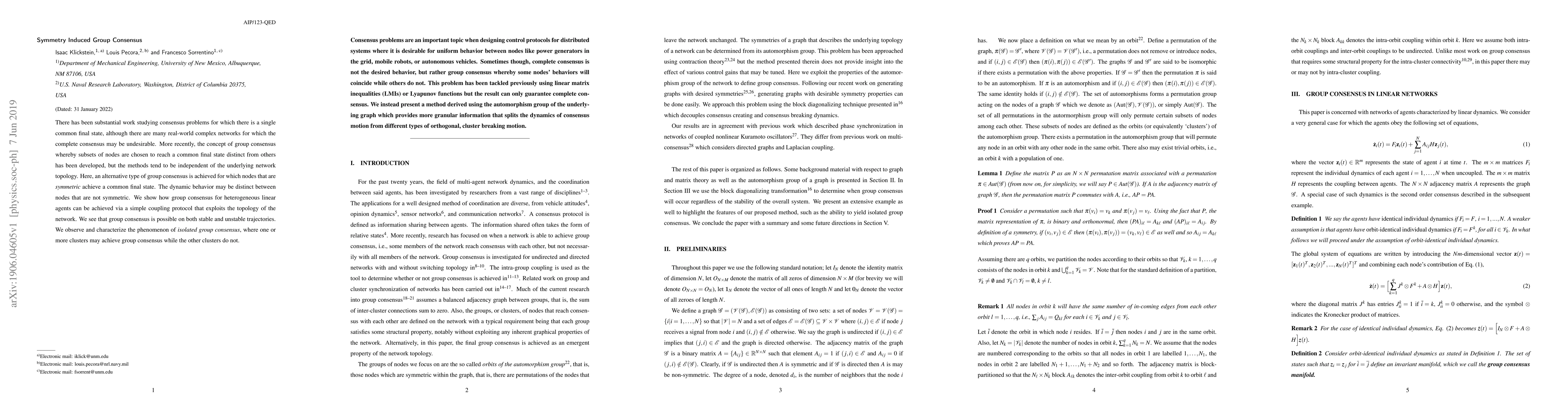 There has been substantial work studying consensus problems for which there is a single common final state, although there are many real-world complex networks for which the complete consensus may be undesirable. More recently, the concept of group consensus whereby subsets of nodes are chosen to reach a common final state distinct from others has been developed, but the methods tend to be independent of the underlying network topology. Here, an alternative type of group consensus is achieved for which nodes that are symmetric achieve a common final state. The dynamic behavior may be distinct between nodes that are not symmetric. We show how group consensus for heterogeneous linear agents can be achieved via a simple coupling protocol that exploits the topology of the network. We see that group consensus is possible on both stable and unstable trajectories. We observe and characterize the phenomenon of isolated group consensus, where one or more clusters may achieve group consensus while the other clusters do not.