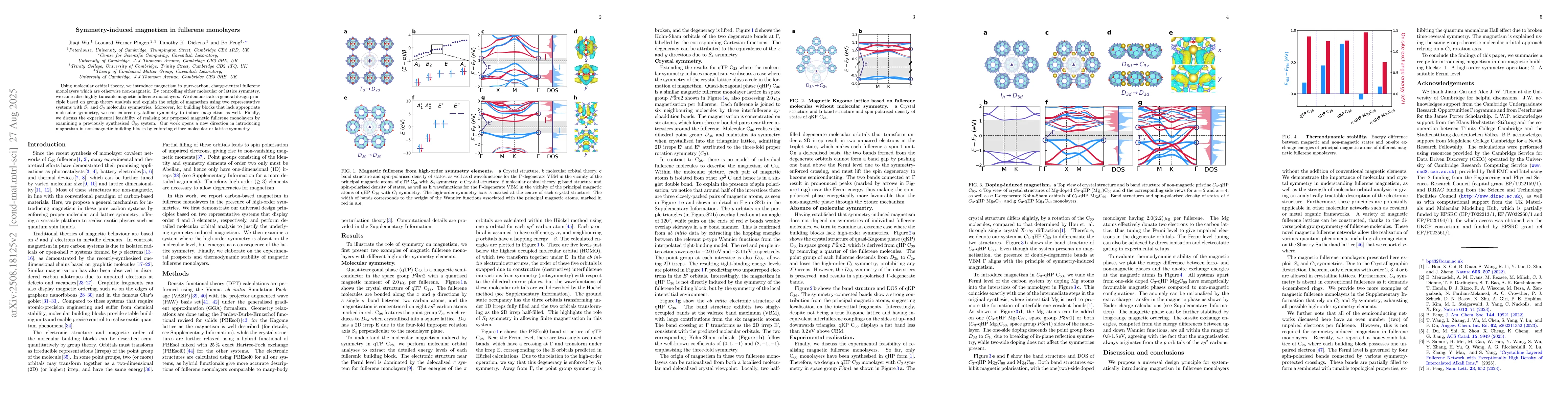 Using molecular orbital theory, we introduce magnetism in pure-carbon, charge-neutral fullerene monolayers which are otherwise non-magnetic. By controlling either molecular or lattice symmetry, we can realise highly-tuneable magnetic fullerene monolayers. We demonstrate a general design principle based on group theory analysis and explain the origin of magnetism using two representative systems with $S_4$ and $C_3$ molecular symmetries. Moreover, for building blocks that lack appropriate molecular symmetry, we can enforce crystalline symmetry to induce magnetism as well. Finally, we discuss the experimental feasibility of realising our proposed magnetic fullerene monolayers by examining a previously synthesised C$_{60}$ system. Our work opens a new direction in introducing magnetism in non-magnetic building blocks by enforcing either molecular or lattice symmetry.