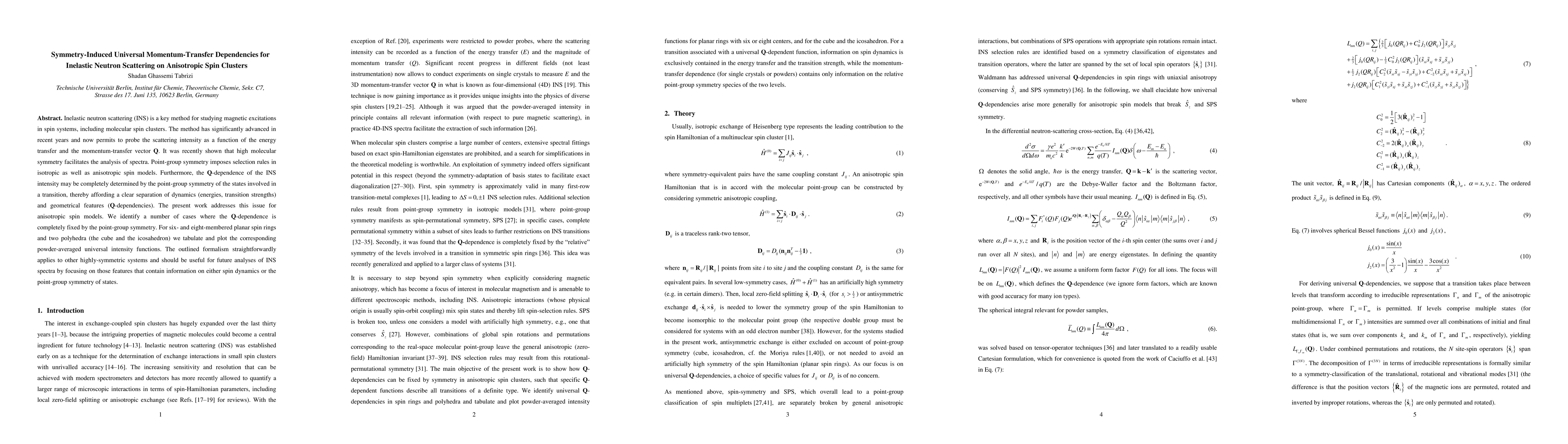 This paper investigates how point-group symmetry in anisotropic spin clusters influences the momentum-transfer dependencies in inelastic neutron scattering. It identifies universal intensity functions for specific highly-symmetric structures, providing a method to separate spin dynamics from geometrical features.