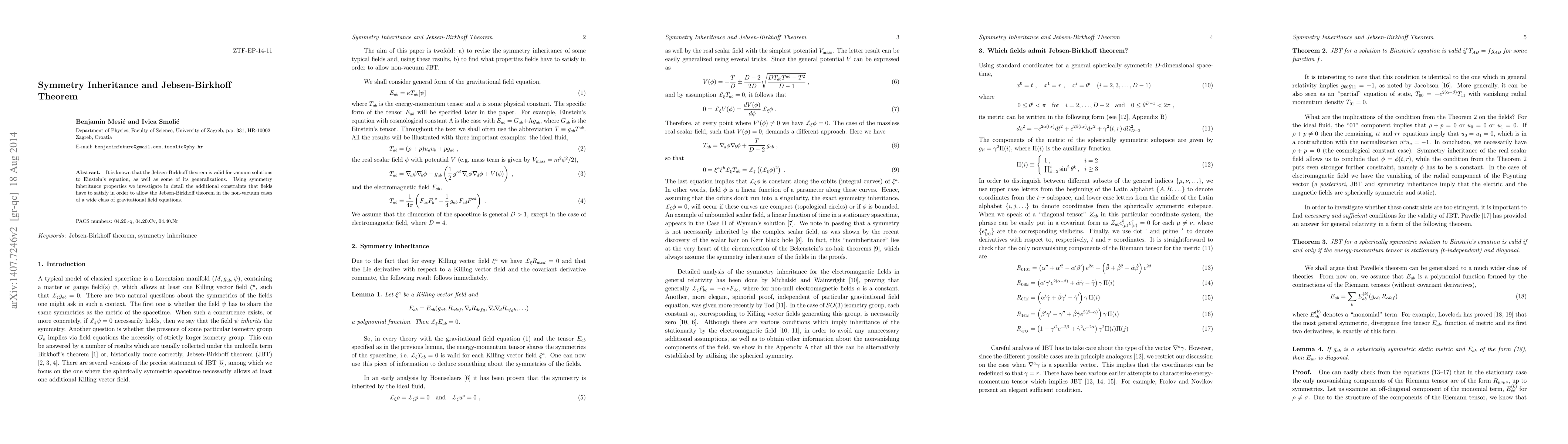 This paper explores the Jebsen-Birkhoff theorem's applicability beyond vacuum solutions by examining symmetry inheritance properties and the additional constraints required for a wide class of gravitational field equations. The focus is on identifying how fields must be structured to uphold the theorem in non-vacuum scenarios.
