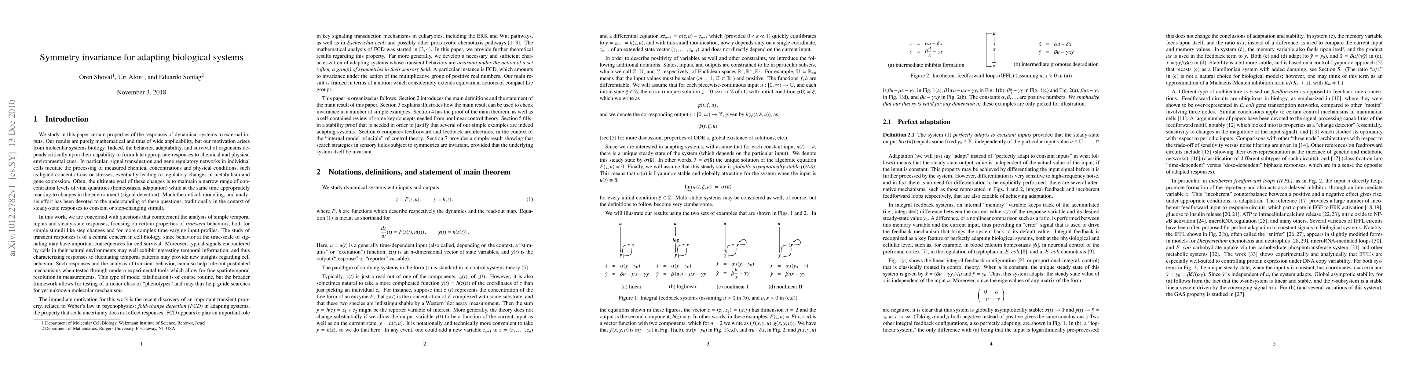 We study in this paper certain properties of the responses of dynamical systems to external inputs. The motivation arises from molecular systems biology. and, in particular, the recent discovery of an important transient property, related to Weber's law in psychophysics: "fold-change detection" in adapting systems, the property that scale uncertainty does not affect responses. FCD appears to play an important role in key signaling transduction mechanisms in eukaryotes, including the ERK and Wnt pathways, as well as in E.coli and possibly other prokaryotic chemotaxis pathways. In this paper, we provide further theoretical results regarding this property. Far more generally, we develop a necessary and sufficient characterization of adapting systems whose transient behaviors are invariant under the action of a set (often, a group) of symmetries in their sensory field. A particular instance is FCD, which amounts to invariance under the action of the multiplicative group of positive real numbers. Our main result is framed in terms of a notion which extends equivariant actions of compact Lie groups. Its proof relies upon control theoretic tools, and in particular the uniqueness theorem for minimal realizations.