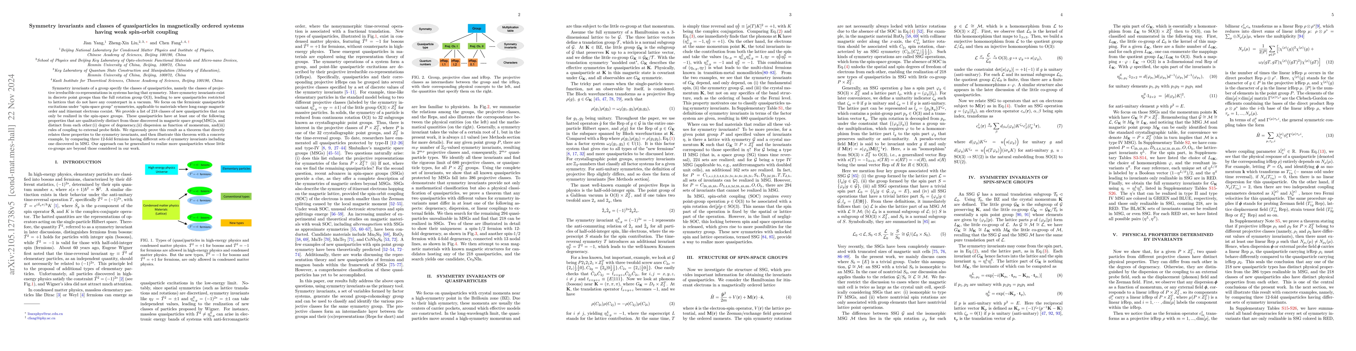 This paper explores symmetry invariants in magnetically ordered systems with weak spin-orbit coupling, identifying 218 new classes of quasiparticles unique to such systems. It demonstrates that these quasiparticles exhibit distinct physical properties, particularly under spin-space group symmetries.