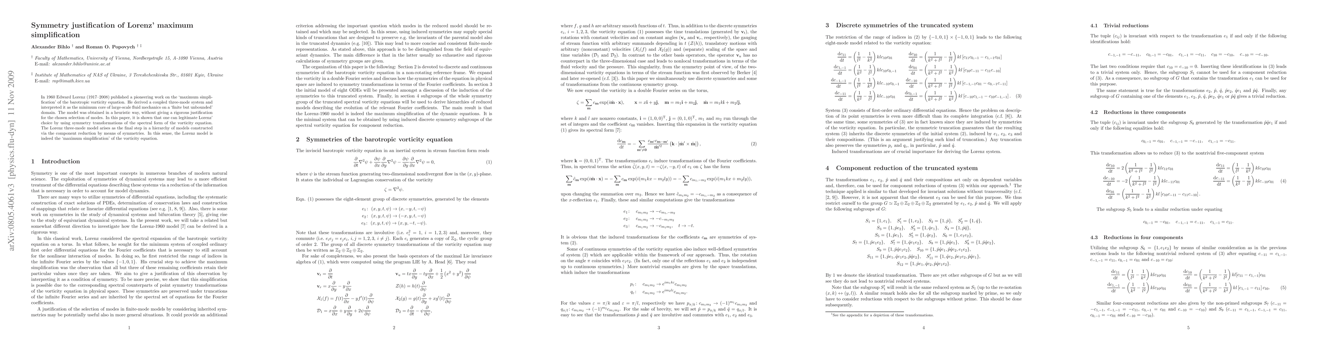 In 1960 Edward Lorenz (1917-2008) published a pioneering work on the `maximum simplification' of the barotropic vorticity equation. He derived a coupled three-mode system and interpreted it as the minimum core of large-scale fluid mechanics on a `finite but unbounded' domain. The model was obtained in a heuristic way, without giving a rigorous justification for the chosen selection of modes. In this paper, it is shown that one can legitimate Lorenz' choice by using symmetry transformations of the spectral form of the vorticity equation. The Lorenz three-mode model arises as the final step in a hierarchy of models constructed via the component reduction by means of symmetries. In this sense, the Lorenz model is indeed the `maximum simplification' of the vorticity equation.