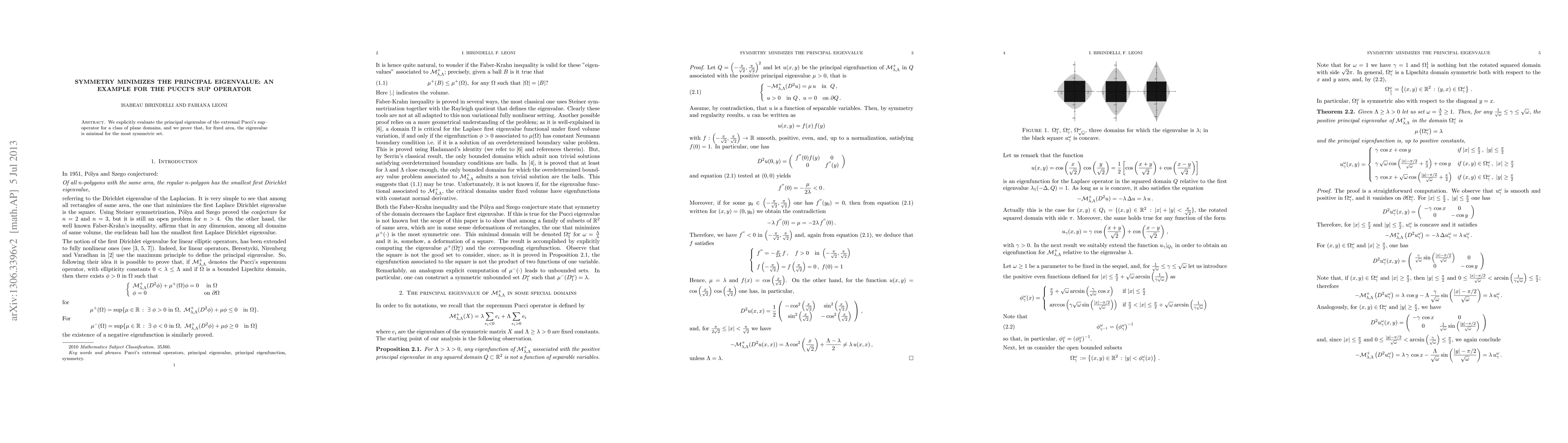 Summary: This paper evaluates the principal eigenvalue of the extremal Pucci's sup-operator for specific plane domains and demonstrates that, for a given area, the most symmetric domains yield the minimal eigenvalue.