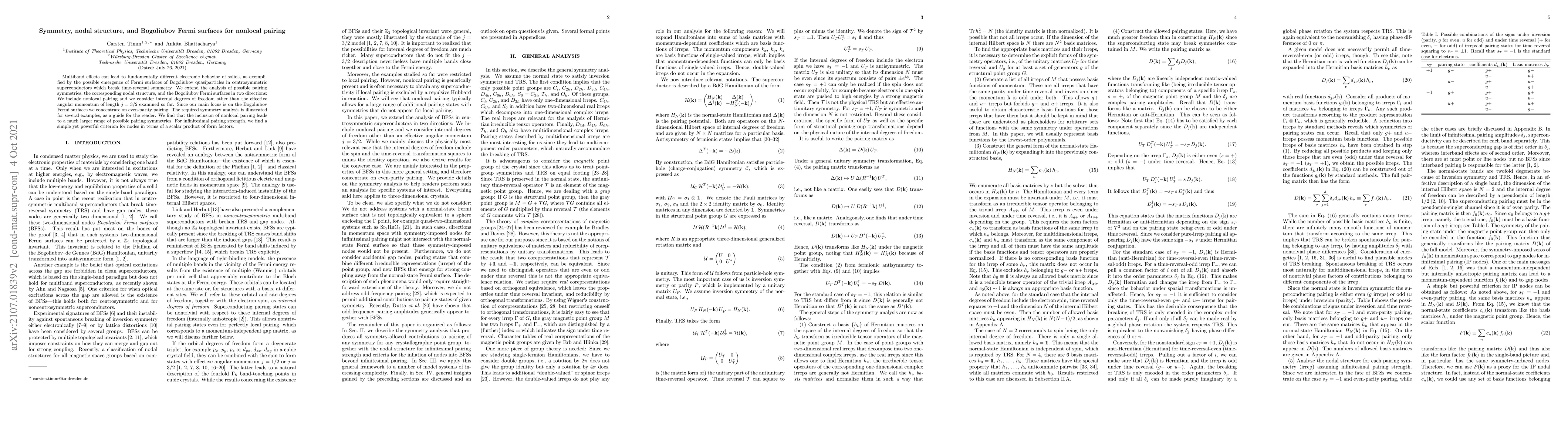 Multiband effects can lead to fundamentally different electronic behavior of solids, as exemplified by the possible emergence of Fermi surfaces of Bogoliubov quasiparticles in centrosymmetric superconductors which break time-reversal symmetry. We extend the analysis of possible pairing symmetries, the corresponding nodal structure, and the Bogoliubov Fermi surfaces in two directions: We include nonlocal pairing and we consider internal degrees of freedom other than the effective angular momentum of length $j=3/2$ examined so far. Since our main focus is on the Bogoliubov Fermi surfaces we concentrate on even-parity pairing. The required symmetry analysis is illustrated for several examples, as a guide for the reader. We find that the inclusion of nonlocal pairing leads to a much larger range of possible pairing symmetries. For infinitesimal pairing strength, we find a simple yet powerful criterion for nodes in terms of a scalar product of form factors.