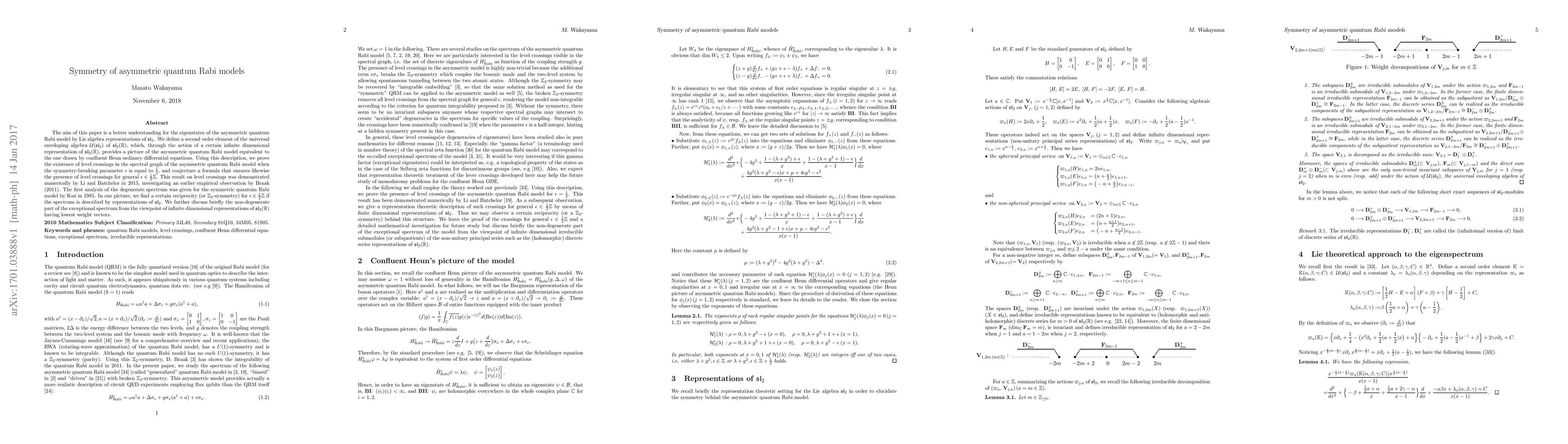 This paper utilizes Lie algebra representations of $mathfrak{sl}_2$ to understand the eigenstates of the asymmetric quantum Rabi model, revealing level crossings in its spectral graph. The research introduces a second-order element in the universal enveloping algebra $mathcal{U}(mathfrak{sl}_2)$, proving level crossings for $epsilon = rac{1}{2}$ and conjecturing their presence for general $epsilon in rac{1}{2}mathbb{Z}$. The study also discovers a $mathbb{Z}_2$-symmetry in the spectrum for $epsilon in rac{1}{2}mathbb{Z}$.