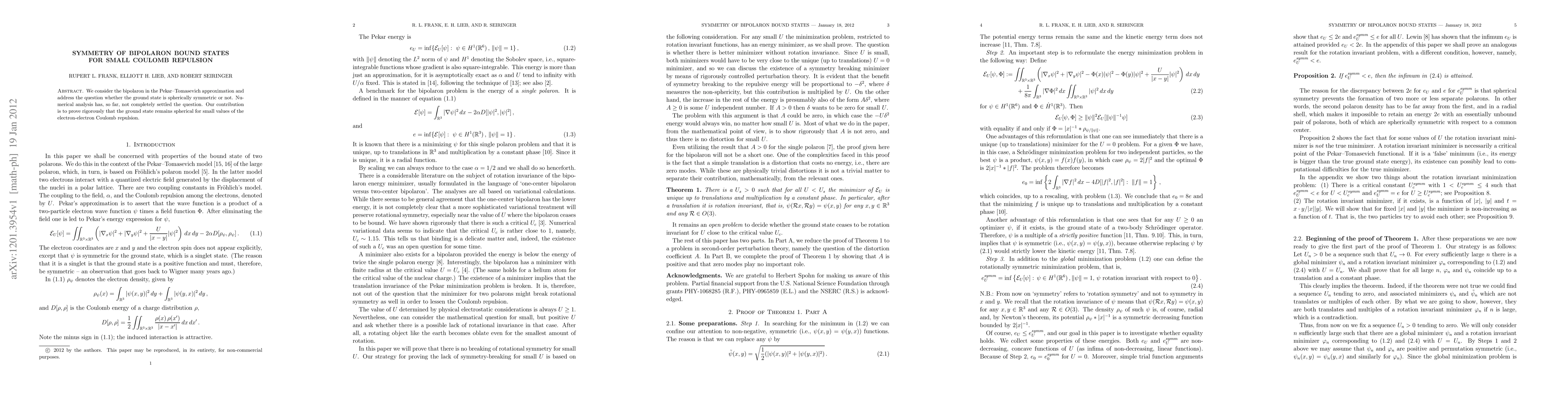 We consider the bipolaron in the Pekar--Tomasevich approximation and address the question whether the ground state is spherically symmetric or not. Numerical analysis has, so far, not completely settled the question. Our contribution is to prove rigorously that the ground state remains spherical for small values of the electron-electron Coulomb repulsion.