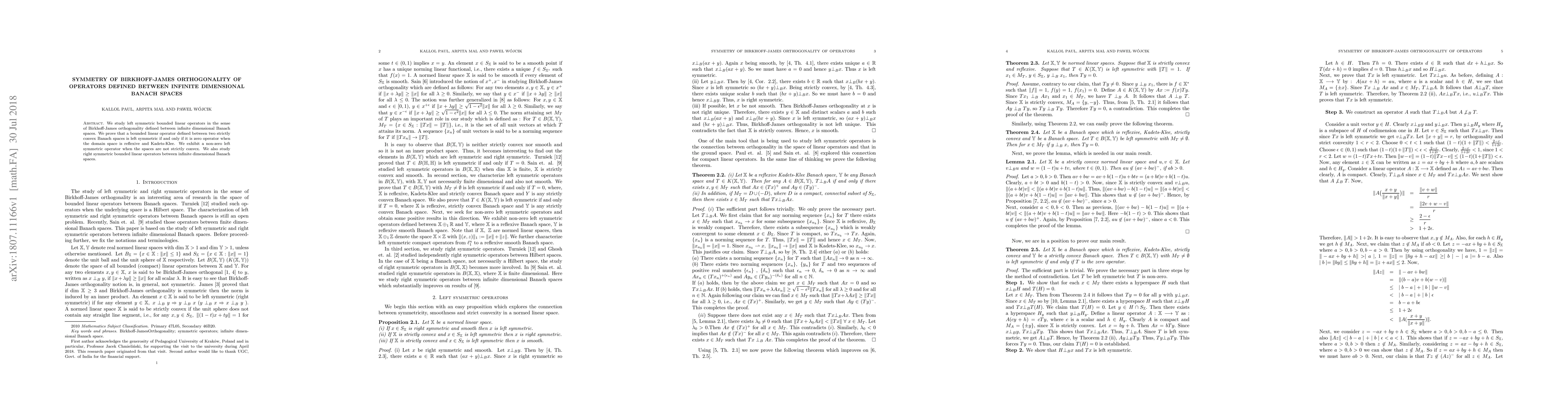 Summary: The paper investigates left and right symmetric bounded linear operators in Birkhoff-James orthogonality contexts between infinite-dimensional Banach spaces, showing that left symmetry implies the operator is zero if the domain is strictly convex, reflexive, and Kadets-Klee. It also presents a non-zero left symmetric operator in non-strictly convex spaces.