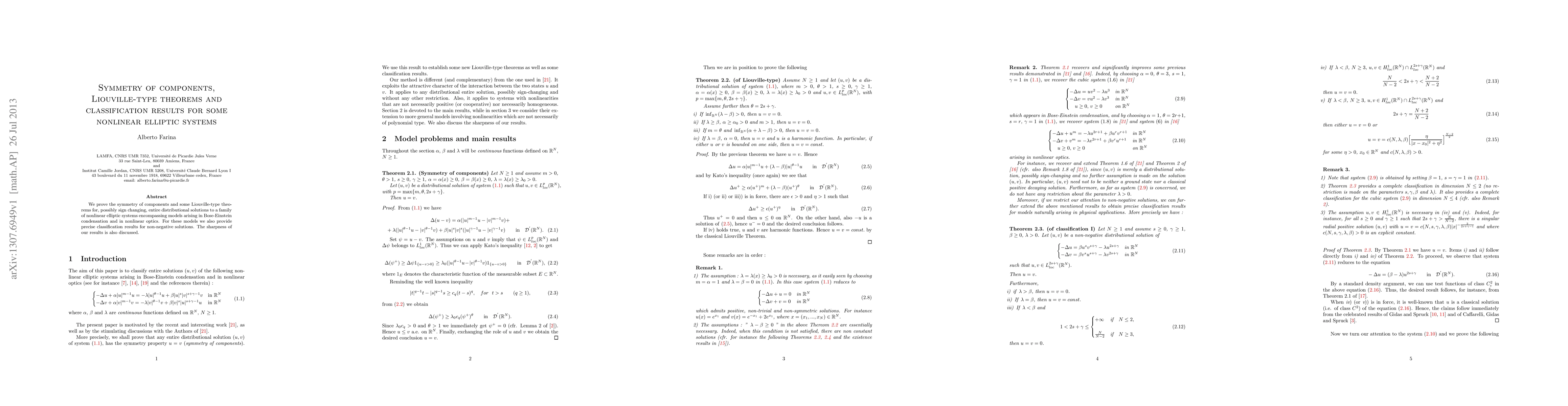 This paper proves symmetry and Liouville-type theorems for entire solutions of nonlinear elliptic systems, relevant to Bose-Einstein condensation and nonlinear optics, and provides classification results for non-negative solutions, discussing the sharpness of these findings.