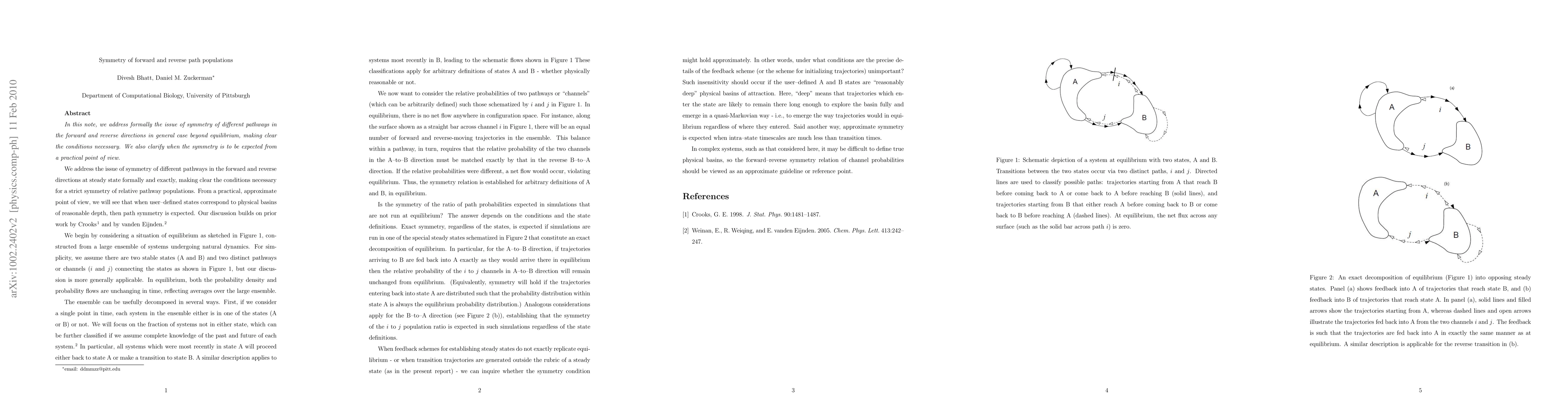 In this note, we address formally the issue of symmetry for probabilities of different dynamical pathways in the forward and reverse directions of a conformational transition. Our discussion is based on a decomposition of equilibrium into opposing steady states, and makes clear the conditions necessary for symmetry to apply. From a practical point of view, we also discuss when approximate symmetry is to be expected.