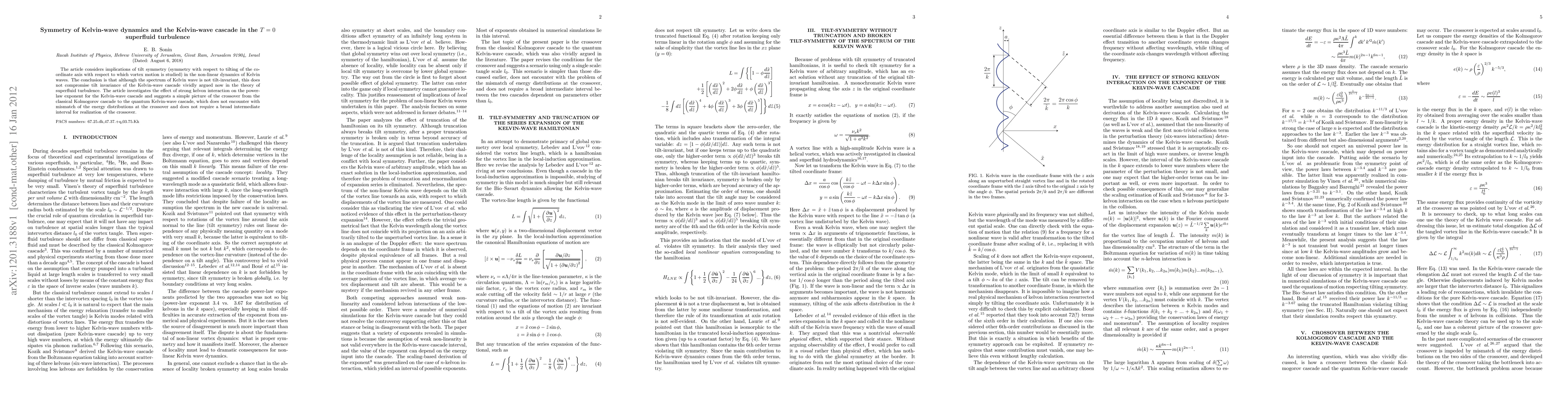 The article considers implications of tilt symmetry (symmetry with respect to tilting of the coordinate axis with respect to which vortex motion is studied) in the non-linear dynamics of Kelvin waves. The conclusion is that although the spectrum of Kelvin wave is not tilt-invariant, this does not compromise tilt invariance of the Kelvin-wave cascade vividly argued now in the theory of superfluid turbulence. The article investigates the effect of strong kelvon interaction on the power-law exponent for the Kelvin-wave cascade and suggests a simple picture of the crossover from the classical Kolmogorov cascade to the quantum Kelvin-wave cascade, which does not encounter with mismatch of the energy distributions at the crossover and does not require a broad intermediate interval for realization of the crossover.