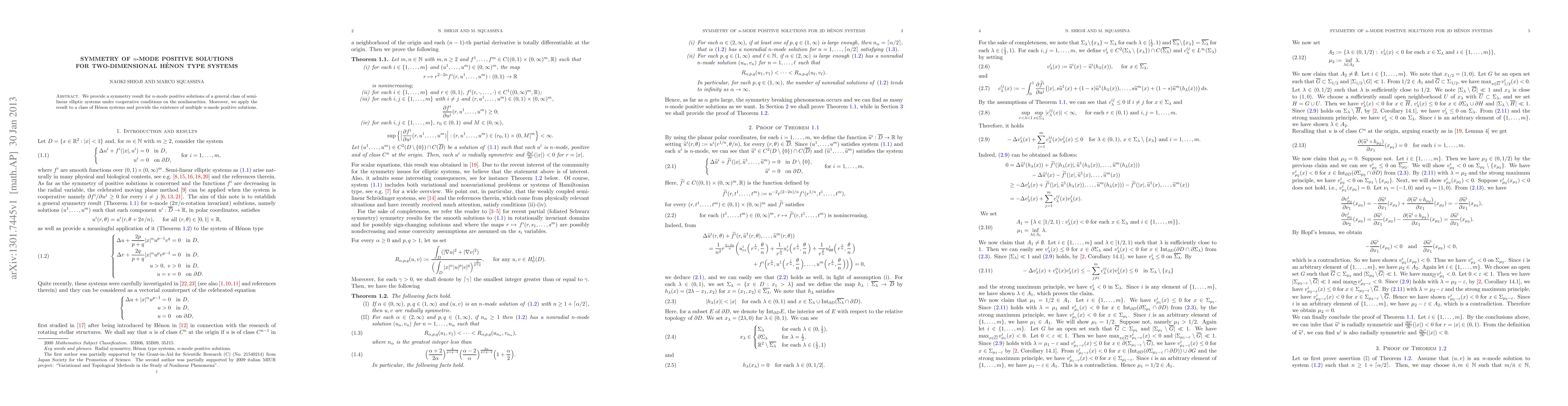 This paper proves symmetry for n-mode positive solutions of two-dimensional Hénon type systems under cooperative conditions on nonlinearities, leading to the existence of multiple solutions.