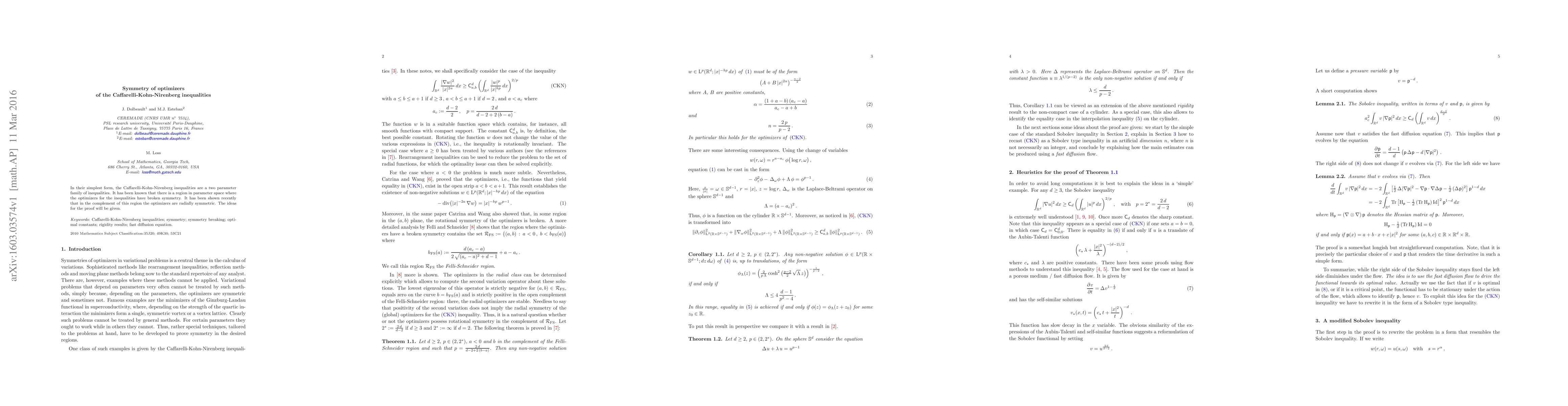 In their simplest form, the Caffarelli-Kohn-Nirenberg inequalities are a two parameter family of inequalities. It has been known that there is a region in parameter space where the optimizers for the inequalities have broken symmetry. It has been shown recently that in the complement of this region the optimizers are radially symmetric. The ideas for the proof will be given.