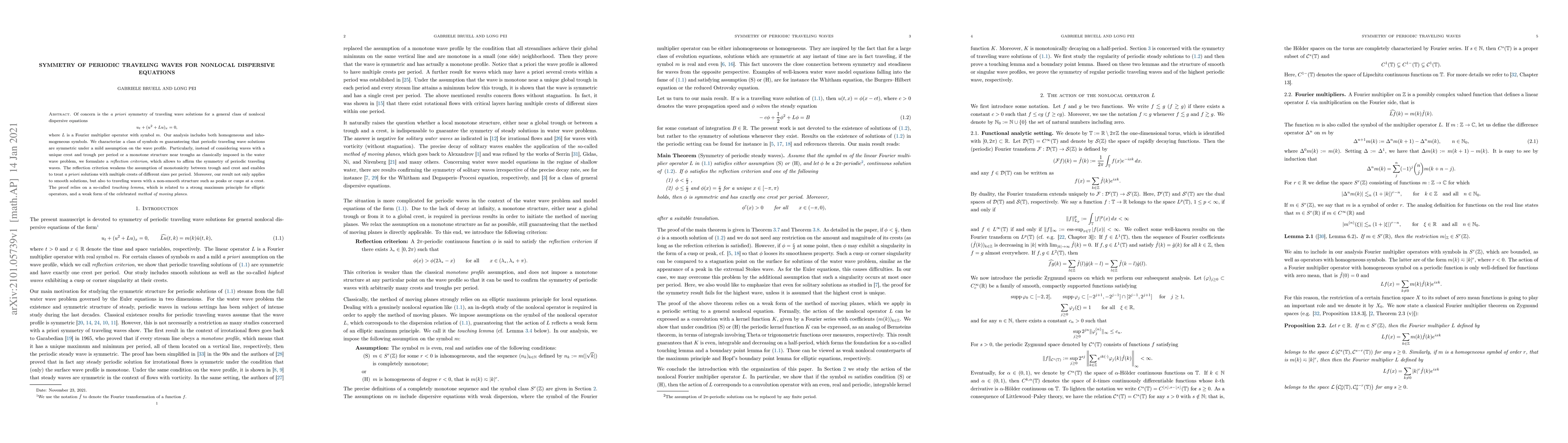 Of concern is the a priori symmetry of traveling wave solutions for a general class of nonlocal dispersive equations \[ u_t +(u^2 +Lu)_x =0, \] where $L$ is a Fourier multiplier operator with symbol $m$. Our analysis includes both homogeneous and inhomogeneous symbols. We characterize a class of symbols $m$ guaranteeing that periodic traveling wave solutions are symmetric under a mild assumption on the wave profile. Particularly, instead of considering waves with a unique crest and trough per period or a monotone structure near troughs as classically imposed in the water wave problem, we formulate a reflection criterion, which allows to affirm the symmetry of periodic traveling waves. The reflection criterion weakens the assumption of monotonicity between trough and crest and enables to treat a priori solutions with multiple crests of different sizes per period. Moreover, our result not only applies to smooth solutions, but also to traveling waves with a non-smooth structure such as peaks or cusps at a crest. The proof relies on a so-called touching lemma, which is related to a strong maximum principle for elliptic operators, and a weak form of the celebrated method of moving planes.