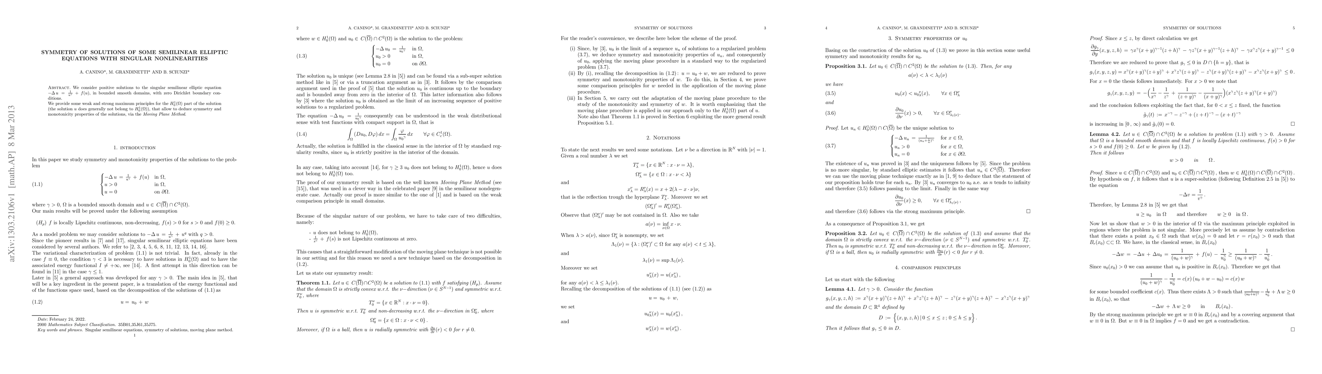 This paper explores positive solutions to singular semilinear elliptic equations with zero Dirichlet boundary conditions, providing weak and strong maximum principles. It deduces symmetry and monotonicity of solutions using the Moving Plane Method.